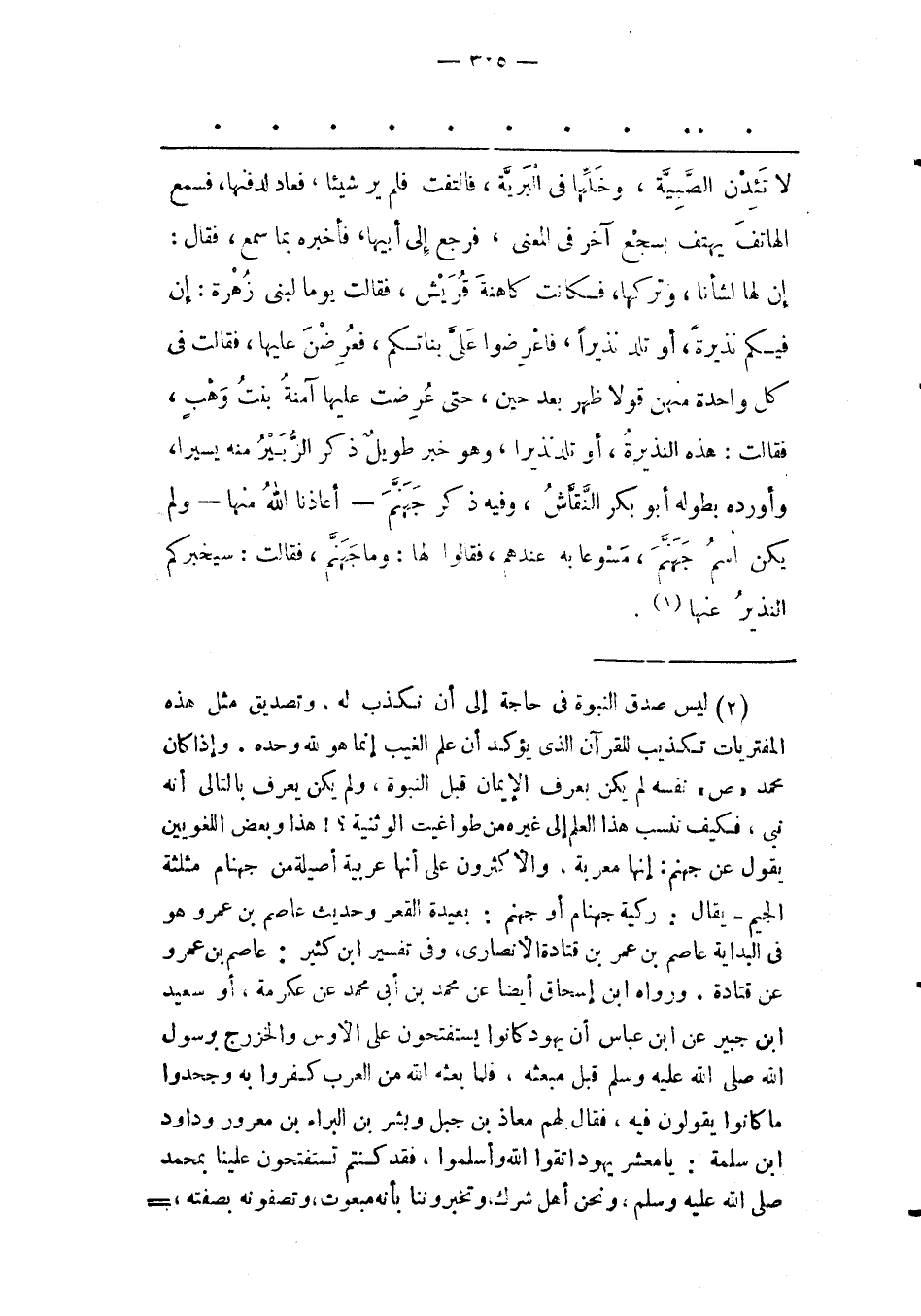 (1) ليس صدق النبوة فى حاجة إلى أن نكذب له، وتصديق مثل هذه المفتريات تكذيب للقرآن الذى يؤكد أن علم الغيب إنما هو لله وحده. وإذا كان محمد «ص» نفسه لم يكن يعرف الإيمان قبل النبوة، ولم يكن يعرف بالتالى أنه نبى، فكيف ننسب هذا العلم إلى غيره من طواغيت الوثنية؟! هذا وبعض اللغويين يقول عن جهنم: إنها معربة، والأكثرون على أنها عربية أصيلة من جهنام مثلثة الجيم- يقال: ركية جهنام أو جهنم: بعيدة القعر وحديث عاصم بن عمر وهو فى البداية عاصم بن عمر بن قتادة الأنصارى، وفى تفسير ابن كثير: عاصم بن عمرو عن قتادة. ورواه ابن إسحاق أيضا عن محمد بن أبى محمد عن عكرمة، أو سعيد ابن جُبَيْرٍ عَنْ ابْنِ عَبّاسٍ أَنّ يَهُودَ كَانُوا يَسْتَفْتِحُونَ عَلَى الْأَوْسِ وَالْخَزْرَجِ بِرَسُولِ اللهِ صَلّى اللهُ عَلَيْهِ وَسَلّمَ قَبْلَ مَبْعَثِهِ، فَلَمّا بَعَثَهُ اللهُ مِنْ الْعَرَبِ كَفَرُوا بِهِ وَجَحَدُوا مَا كَانُوا يَقُولُونَ فِيهِ، فَقَالَ لَهُمْ مُعَاذُ بْنُ جبل وبشر بن البراء بن معرور وداود ابن سَلَمَةَ: يَا مَعْشَرَ يَهُودَ اتّقُوا اللهَ وَأَسْلِمُوا، فقد كنتم تستفتحون علينا بمحمد صلى الله عليه وسلم، ونحن أهل شرك، وتخبروننا بأنه مبعوث، وتصفونه بصفته، -
