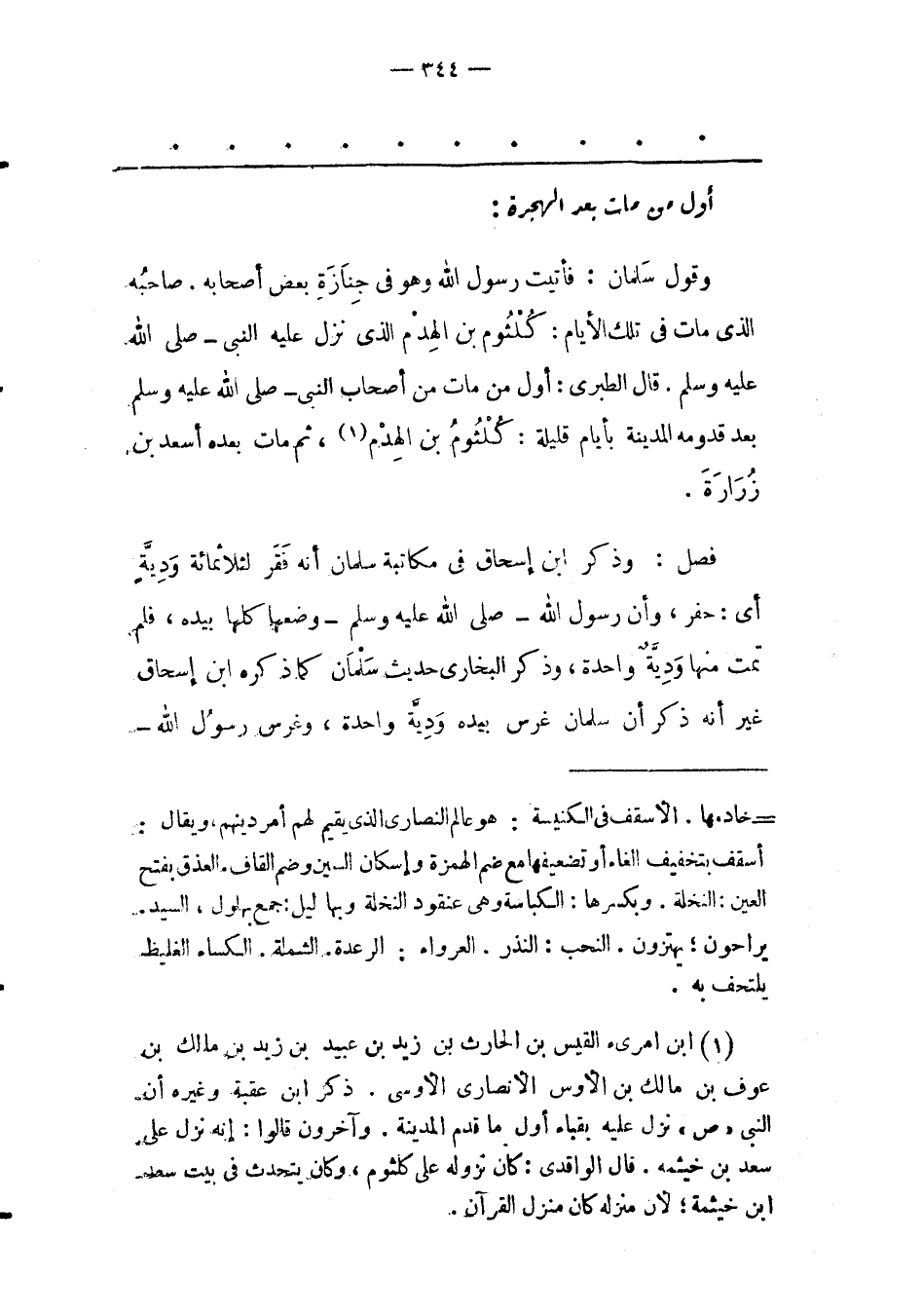 وَقَوْلُ سَلْمَانَ: فَأَتَيْت رَسُولَ اللهِ وَهُوَ فِي جِنَازَةِ بَعْضِ أَصْحَابِهِ. صَاحِبُهُ الّذِي مَاتَ فِي تِلْكَ الْأَيّامِ: كُلْثُومُ بْنُ الْهِدْمِ الّذِي نَزَلَ عَلَيْهِ النّبِيّ- صَلَّى اللَّهُ عَلَيْهِ وَسَلَّمَ. قَالَ الطّبَرِيّ: أَوّلُ مَنْ مَاتَ مِنْ أَصْحَابِ النّبِيّ- صَلَّى اللَّهُ عَلَيْهِ وَسَلَّمَ بَعْدَ قُدُومِهِ الْمَدِينَةَ بِأَيّامِ قَلِيلَةٍ: كُلْثُومُ بْنُ الْهِدْمِ «1» ، ثُمّ مَاتَ بَعْدَهُ أَسْعَدُ بْنُ زُرَارَةَ.