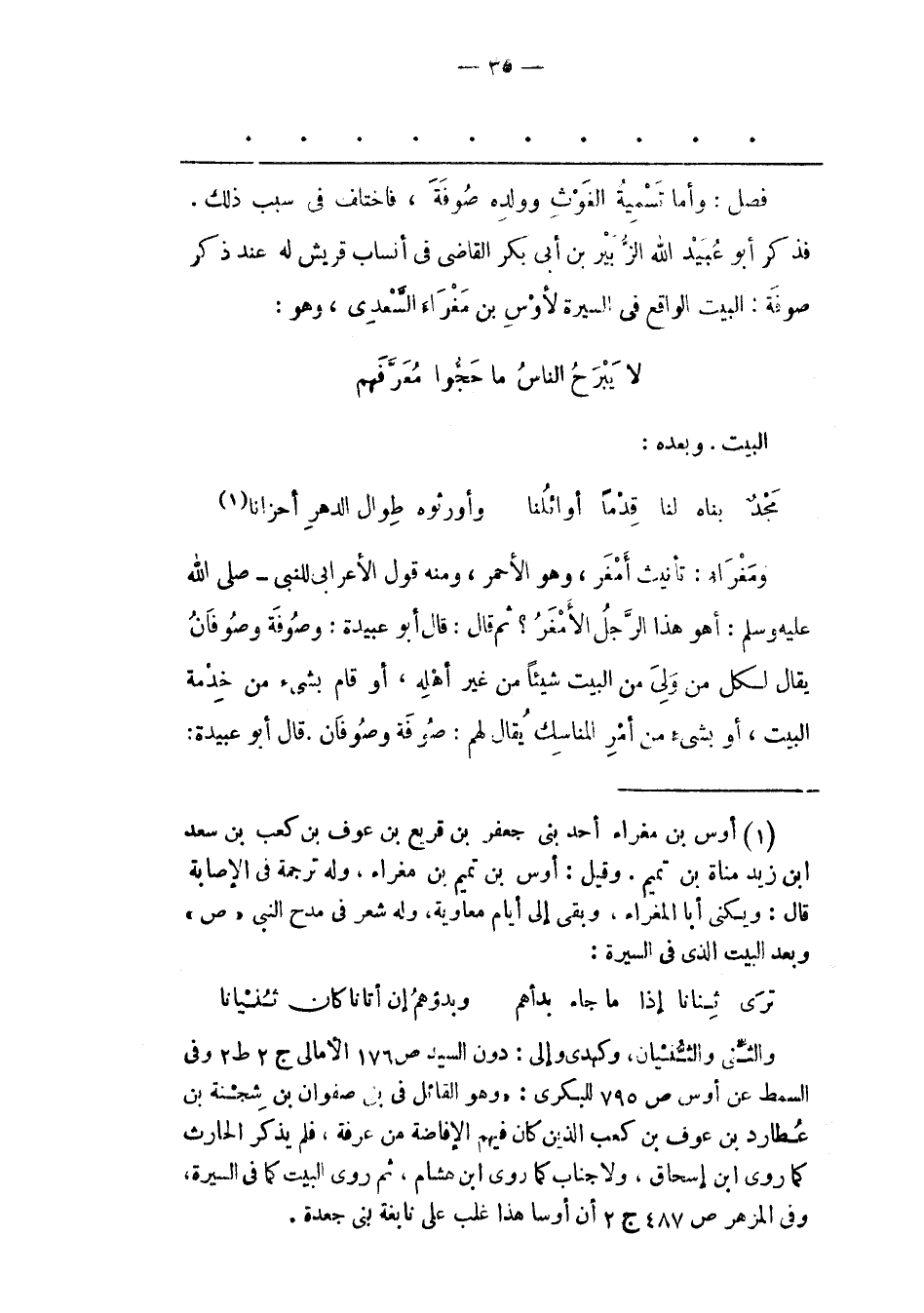 فَذَكَرَ أَبُو عُبَيْدِ اللهِ الزّبَيْرُ بْنُ أَبِي بَكْرٍ الْقَاضِي فِي أَنْسَابِ قُرَيْشٍ لَهُ عِنْدَ ذِكْرِ صُوفَةَ: الْبَيْتَ الْوَاقِعَ فِي السّيرَةِ لِأَوْسِ بْنِ مَغْرَاءَ السّعْدِيّ، وَهُوَ: