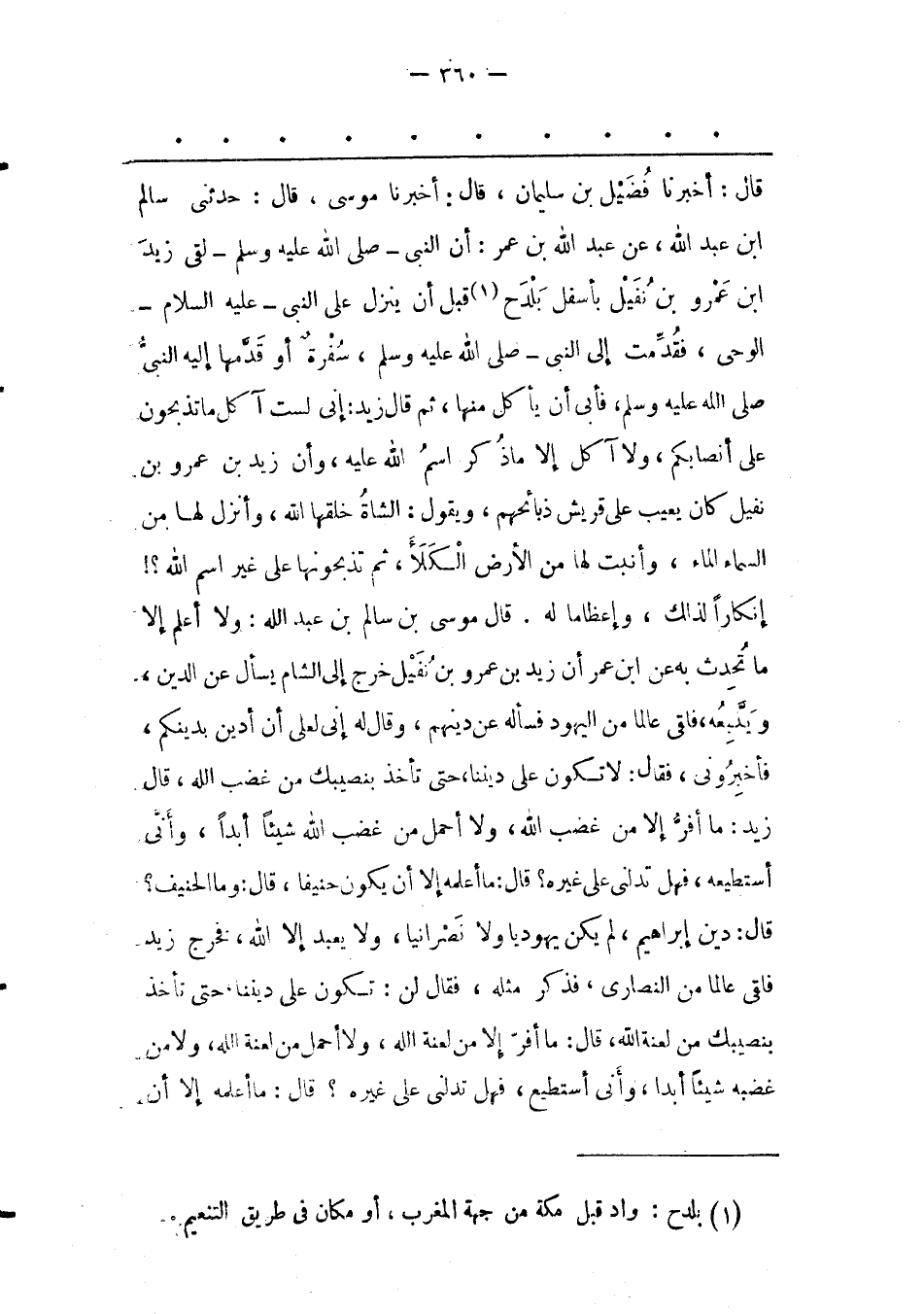 قَالَ: أَخْبَرَنَا فُضَيْلُ بْنُ سُلَيْمَانَ، قَالَ: أَخْبَرَنَا موسى، قال: حدثنى سالم ابن عَبْدِ اللهِ، عَنْ عَبْدِ اللهِ بْنِ عُمَرَ: أَنّ النّبِيّ- صَلَّى اللَّهُ عَلَيْهِ وَسَلَّمَ- لَقِيَ زيد ابن عَمْرِو بْنِ نُفَيْلٍ بِأَسْفَلَ بَلْدَحَ «1» قَبْلَ أَنْ يَنْزِلَ عَلَى النّبِيّ- عَلَيْهِ السّلَامُ- الْوَحْيُ، فَقُدّمَتْ إلَى النّبِيّ- صَلَّى اللَّهُ عَلَيْهِ وَسَلَّمَ، سُفْرَةٌ أَوْ قَدّمَهَا إلَيْهِ النّبِيّ صَلَّى اللَّهُ عَلَيْهِ وَسَلَّمَ، فَأَبَى أَنْ يَأْكُلَ مِنْهَا، ثُمّ قَالَ زَيْدٌ: إنّي لَسْت آكُلُ مَا تَذْبَحُونَ عَلَى أَنْصَابِكُمْ، وَلَا آكُلُ إلّا مَا ذُكِرَ اسْمُ اللهِ عَلَيْهِ، وَأَنّ زَيْدَ بْنَ عَمْرِو بْنِ نُفَيْلٍ كَانَ يَعِيبُ عَلَى قُرَيْشٍ ذَبَائِحَهُمْ، وَيَقُولُ: الشّاةُ خَلَقَهَا اللهُ، وَأَنْزَلَ لَهَا مِنْ السّمَاءِ الْمَاءَ، وَأَنْبَتَ لَهَا مِنْ الْأَرْضِ الْكَلَأَ، ثُمّ تَذْبَحُونَهَا عَلَى غَيْرِ اسْمِ اللهِ؟! إنْكَارًا لِذَلِك، وَإِعْظَامًا لَهُ. قَالَ مُوسَى بْنُ سَالِمِ بْنِ عَبْدِ اللهِ: وَلَا أَعْلَمُ إلّا مَا تَحَدّثَ بِهِ عَنْ ابْنِ عُمَرَ أَنّ زَيْدَ بْنَ عَمْرِو بْنِ نُفَيْلٍ خَرَجَ إلَى الشّامِ يَسْأَلُ عن الدين، وينّبعه، فَلَقِيَ عَالِمًا مِنْ الْيَهُودِ فَسَأَلَهُ عَنْ دِينِهِمْ، وَقَالَ لَهُ إنّي لَعَلّي أَنْ أَدِينَ بِدِينِكُمْ، فَأَخْبِرُونِي، فَقَالَ: لَا تَكُونُ عَلَى دِينِنَا، حَتّى تَأْخُذَ بِنَصِيبِك مِنْ غَضَبِ اللهِ، قَالَ زَيْدٌ: مَا أَفِرّ إلّا مِنْ غَضَبِ اللهِ، وَلَا أَحْمِلُ مِنْ غَضَبِ اللهِ شَيْئًا أَبَدًا، وَأَنّى أَسْتَطِيعُهُ، فَهَلْ تَدُلّنِي عَلَى غَيْرِهِ؟ قَالَ: مَا أَعْلَمُهُ إلّا أَنْ يَكُونَ حَنِيفًا، قَالَ: وَمَا الْحَنِيفُ؟