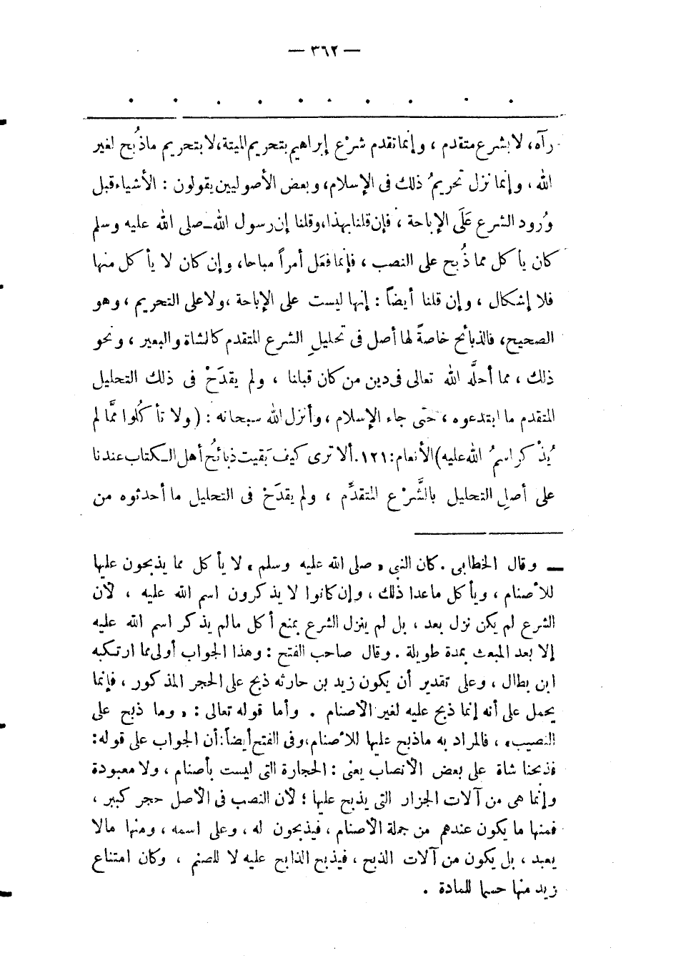 - وقال الخطابى. كان النبى «صلى الله عليه وسلم» لا يأكل مما يذبحون عليها للأصنام، ويأكل ما عدا ذلك، وإن كانوا لا يذكرون اسم الله عليه، لأن الشرع لم يكن نزل بعد، بل لم ينزل الشرع بمنع أكل ما لم يذكر اسم الله عليه إلا بعد المبعث بمدة طويلة. وقال صاحب الفتح: وهذا الجواب أولى مما ارتكبه ابن بطال، وعلى تقدير أن يكون زيد بن حارثه ذبح على الحجر المذكور، فإنما يحمل على أنه إنما ذبح عليه لغير الأصنام. وأما قوله تعالى: «وما ذبح على النصيب» ، فالمراد به ما ذبح عليها للأصنام، وفى الفتح أيضا: أن الجواب على قوله: فذبحنا شاة على بعض الأنصاب يعنى: الحجارة التى ليست بأصنام، ولا معبودة وإنما هى من آلات الجزار التى يذبح عليها؛ لأن النصب فى الأصل حجر كبير، فمنها ما يكون عندهم من جملة الأصنام، فيذبحون له، وعلى اسمه، ومنها مالا يعبد، بل يكون عندهم من آلات الذبح، فيذبح الذابح عليه لا للصنم، وكان امتناع زيد منها حسما للمادة.