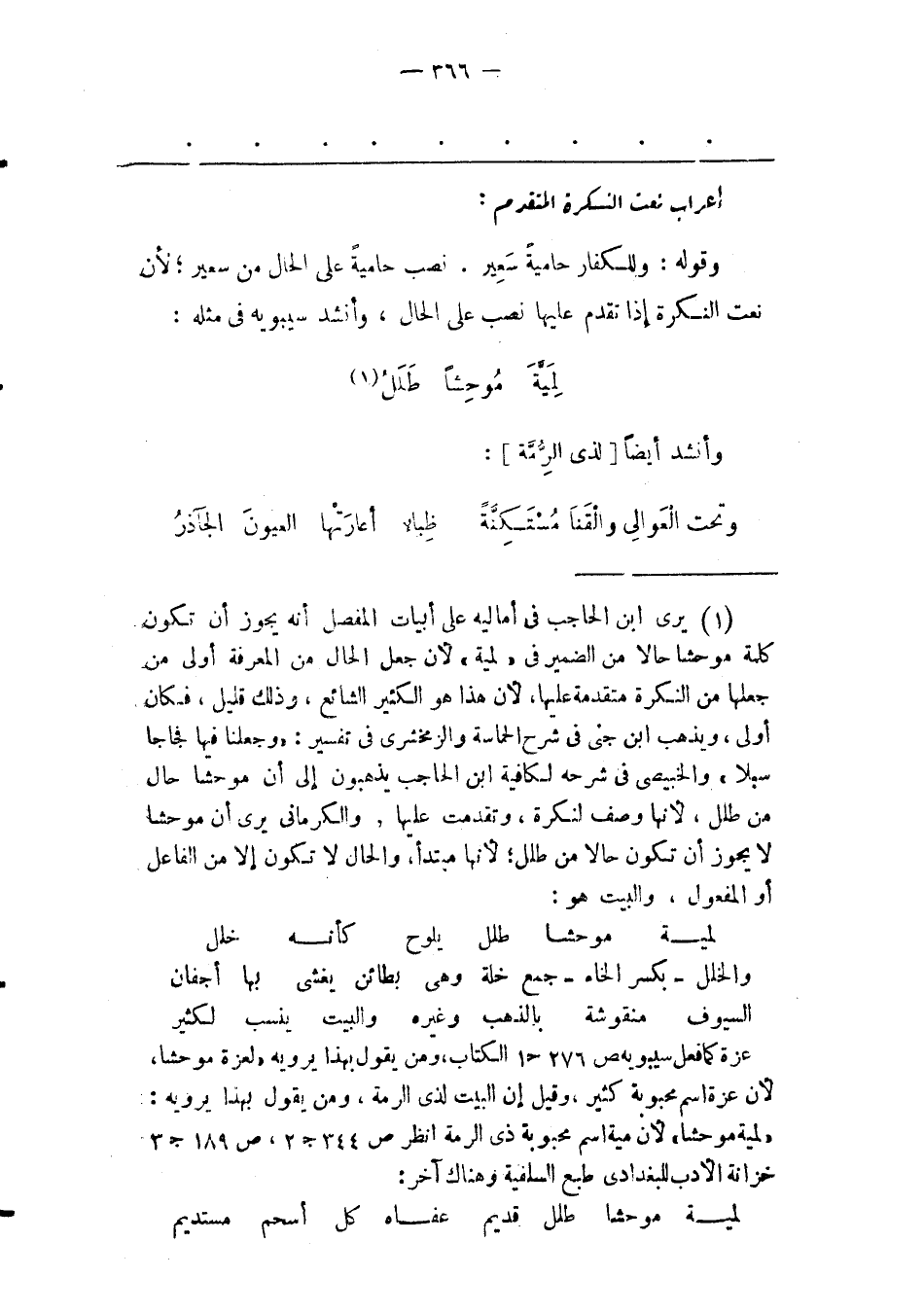 (1) يرى ابن الحاجب فى أماليه على أبيات المفصّل أنه يجوز أن تكون كلمة موحشا حالا من الضمير فى «لمية» لأن جعل الحال من المعرفة أولى من جعلها من النكرة متقدمة عليها، لأن هذا هو الكثير الشائع، وذلك قليل، فكان أولى، ويذهب ابن جنى فى شرح الحماسة والزمخشرى فى تفسير: «وجعلنا فيها فجاجا سبلا» والخبيصى فى شرحه لكافية ابن الحاجب يذهبون إلى أن موحشا حال من طلل، لأنها وصف لنكرة، وتقدمت عليها، والكرمانى يرى أن موحشا لا يجوز أن تكون حالا من طلل؛ لأنها مبتدأ، والحال لا تكون إلا من الفاعل أو المفعول، والبيت هو: