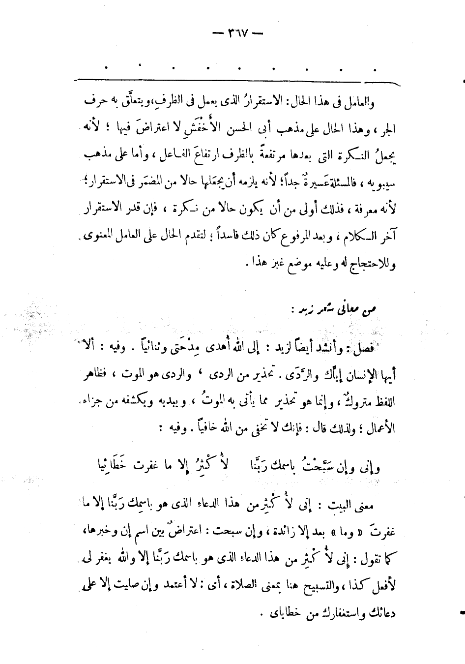 مَعْنَى الْبَيْتِ: إنّي لَأُكْثِرُ مِنْ هَذَا الدّعَاءِ الّذِي هُوَ بِاسْمِك رَبّنَا إلّا مَا غَفَرْت «وَمَا» بَعْدَ إلّا زَائِدَةٌ، وَإِنْ سَبّحْت: اعْتِرَاضٌ بَيْنَ اسْمِ إنّ وَخَبَرِهَا، كَمَا تَقُولُ: إنّي لَأُكْثِرُ مِنْ هَذَا الدّعَاءِ الّذِي هُوَ بِاسْمِك رَبّنَا إلّا وَاَللهِ يَغْفِرُ لِي لَأَفْعَلُ كَذَا، وَالتّسْبِيحُ هُنَا بِمَعْنَى الصّلَاةِ، أَيْ: لَا أَعْتَمِدُ وَإِنْ صَلّيْت إلّا عَلَى دُعَائِك وَاسْتِغْفَارِك مِنْ خَطَايَايَ.