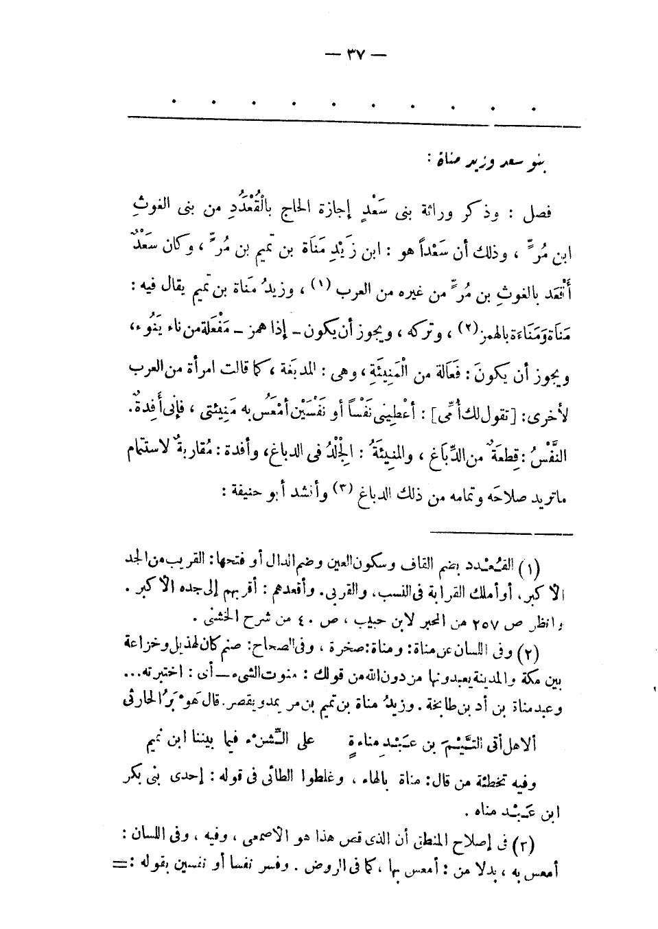 فَصْلٌ: وَذَكَرَ وِرَاثَةَ بَنِي سَعْدٍ إجَازَةَ الْحَاجّ بِالْقُعْدُدِ مِنْ بَنِي الغوث ابن مُرّ، وَذَلِكَ أَنّ سَعْدًا هُوَ: ابْنُ زَيْدِ مَنَاةَ بْنِ تَمِيمِ بْنِ مُرّ، وَكَانَ سَعْدٌ أَقْعَدَ بِالْغَوْثِ بْنِ مُرّ مِنْ غَيْرِهِ مِنْ الْعَرَبِ «1» ، وَزَيْدُ مَنَاةَ بْنُ تَمِيمٍ يُقَالُ فِيهِ: