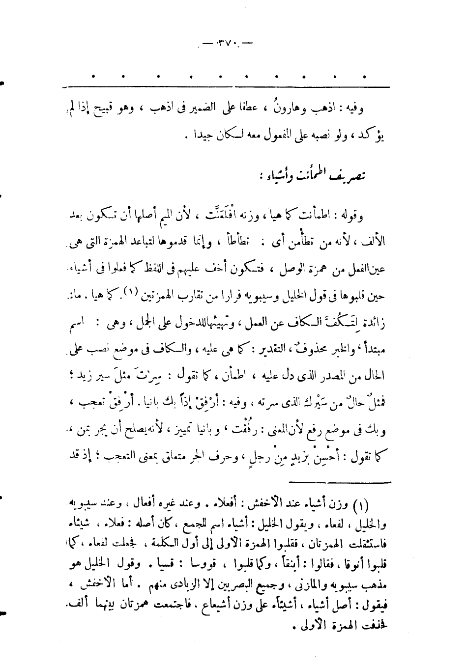 (1) وزن أشياء عند الأخفش: أفعلاء. وعند غيره أفعال، وعند سيبويه والخليل، لفعاء، ويقول الخليل: أشياء اسم للجمع، كان أصله: فعلاء، شيئاء فاستثقلت الهمزتان، فقلبوا الهمزة الأولى إلى أول الكلمة، فجعلت لفعاء، كما قلبوا أنوقا، فقالوا: أينقا، وكما قلبوا، قووسا: قسيا. وقول الخليل هو مذهب سيبويه والمازنى، وجميع البصريين إلا الزيادى منهم. أما الأخفش، فيقول: أصل أشياء، أشيئاء على وزن أشيعاع، فاجتمعت همزتان بينهما ألف فحذفت الهمزة الأولى.