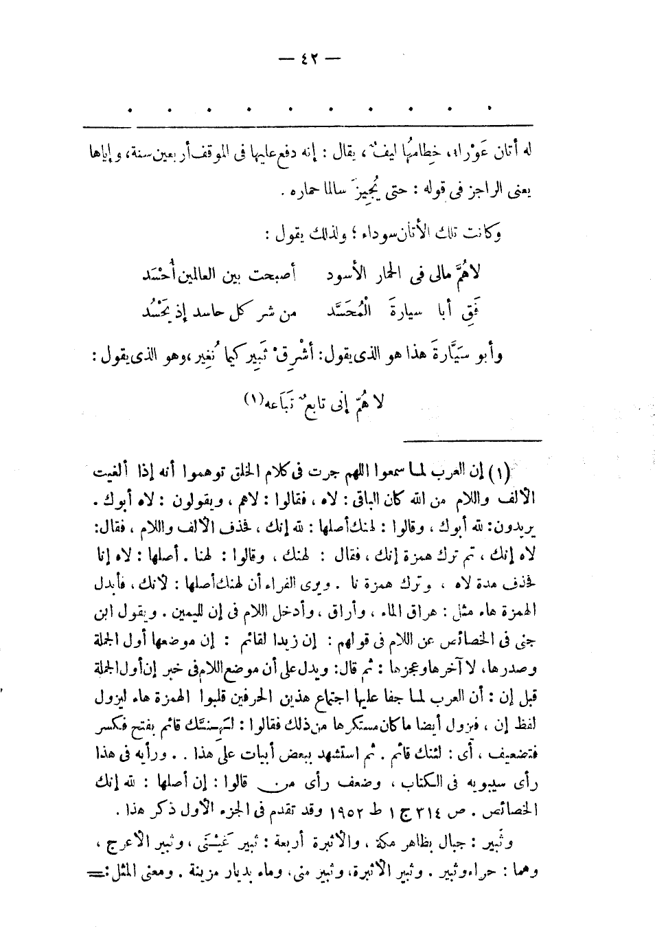 (1) إن العرب لما سمعوا اللهم جرت فى كلام الخلق توهموا أنه إذا ألغيت الألف واللام من الله كان الباقى: لاه، فقالوا: لاهم، ويقولون: لاه أبوك. يريدون: لله أبوك. وقالوا: لهنك أصلها: لله إنك، فحذف الألف واللام، فقال: لاه إنك، تم ترك همزة إنك، فقال: لهنك، وقالوا: لهنا. أصلها: لاه إنا فحذف مدة لاه، وترك همزة نا. ويرى الفراء أن لهنك أصلها: لأنك، فأبدل الهمزة هاء مثل: هراق الماء، وأراق، وأدخل اللام فى إن لليمين. ويقول ابن جنى فى الخصائص عن اللام فى قولهم: إن زيدا لقائم: إن موضعها أول الجملة وصدرها، لا آخرها وعجزها: ثم قال: ويدل على أن موضع اللام فى خبر إن أول الجملة قبل إن: أن العرب لما جفا عليها اجتماع هذين الحرفين قلبوا الهمزة هاء ليزول لفظ إن، فيزول أيضا ما كان مستكرها من ذلك فقالوا: لهنّك قائم بفتح فكسر فتضعيف، أى: لئنك قائم. ثم استشهد ببعض أبيات على هذا.. ورأيه فى هذا رأى سيبويه فى الكتاب، وضعف رأى من قالوا: إن أصلها: لله إنك الخصائص. ص 314 ج 1 ط 1952 وقد تقدم فى الجزء الأول ذكر هذا. وثبير: جبال بظاهر مكة، والأثبرة أربعة: ثبير عينى، وثبير الأعرج، وهما: حراء وثبير. ثبير الأثبرة، وثبير منى: وماء بديار مزينة. ومعنى المثل: