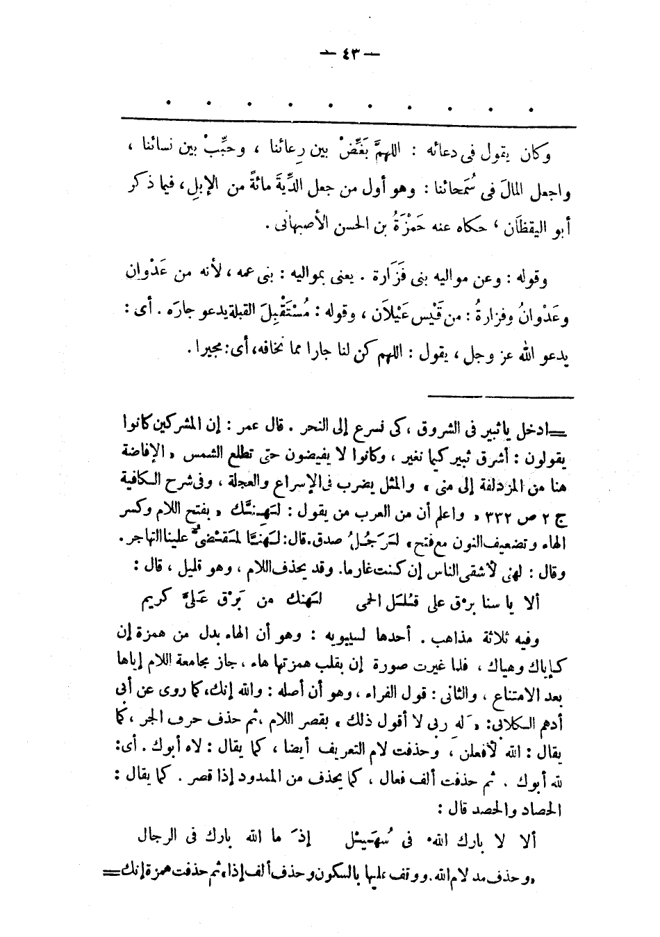 وَقَوْلُهُ: وَعَنْ مَوَالِيهِ بَنِي فَزَارَهْ. يَعْنِي بِمَوَالِيهِ: بَنِي عَمّهِ، لِأَنّهُ مِنْ عَدْوَانَ وَعَدْوَانُ وَفَزَارَةُ: مِنْ قَيْسِ عَيْلَانَ، وَقَوْلُهُ: مُسْتَقْبِلَ الْقِبْلَةِ يَدْعُو جَارَهْ. أَيْ: