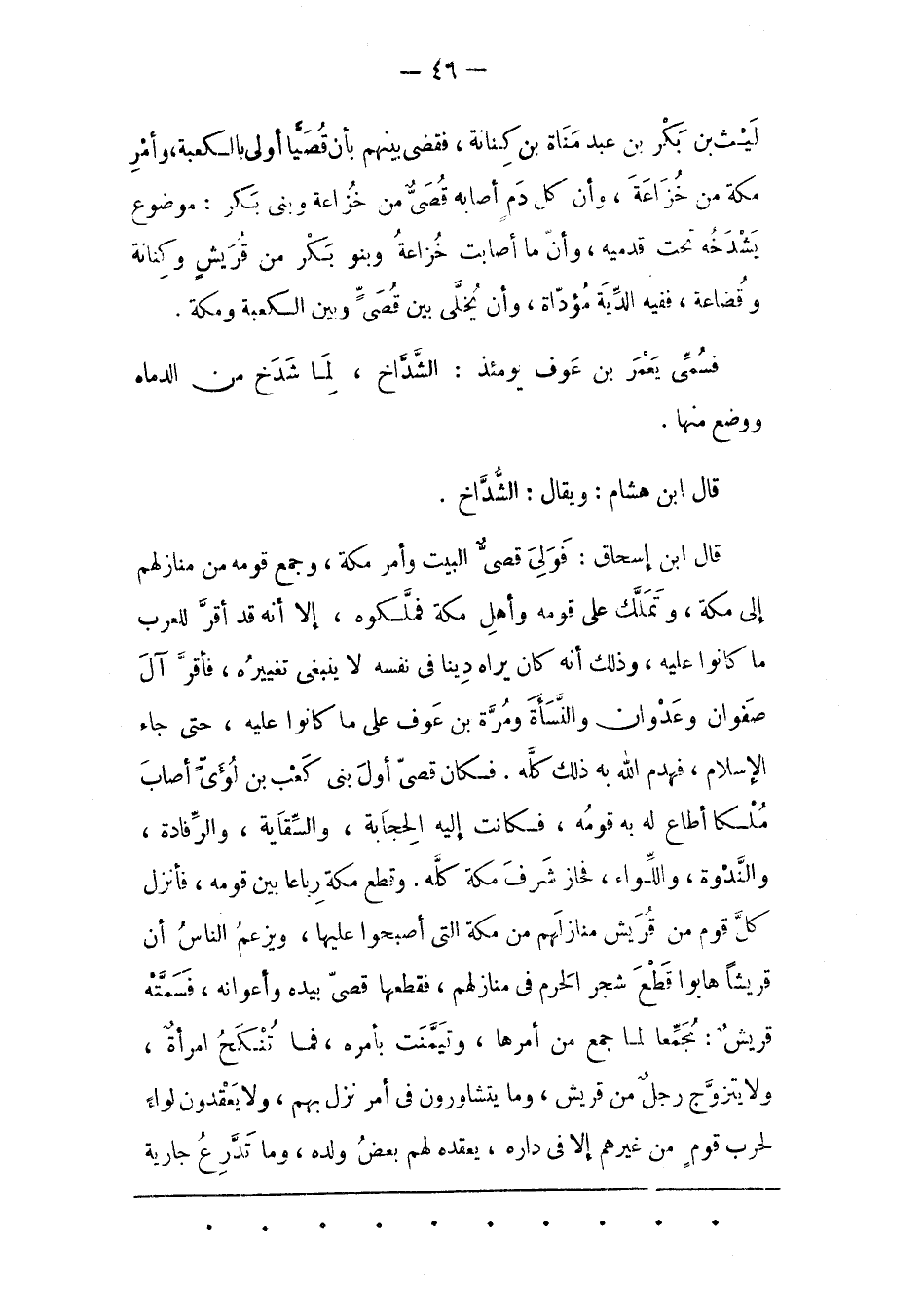 لَيْثِ بْنِ بَكْرِ بْنِ عَبْدِ مَنَاةَ بْنِ كِنَانَةَ، فَقَضَى بَيْنَهُمْ بِأَنّ قُصَيّا أَوْلَى بِالْكَعْبَةِ، وَأَمْرِ مَكّةَ مِنْ خُزَاعَةَ، وَأَنّ كُلّ دَمٍ أَصَابَهُ قُصَيّ مِنْ خُزَاعَةَ وَبَنِيّ بَكْرٍ: مَوْضُوعٌ يَشْدَخُهُ تَحْتَ قَدَمَيْهِ، وَأَنّ مَا أَصَابَتْ خُزَاعَةُ وَبَنُو بَكْرٍ مِنْ قُرَيْشٍ وَكِنَانَةَ وَقُضَاعَةَ، فَفِيهِ الدّيَةُ مُؤَدّاةٌ، وَأَنْ يُخَلّى بَيْنَ قُصَيّ وَبَيْنَ الكعبة ومكة.