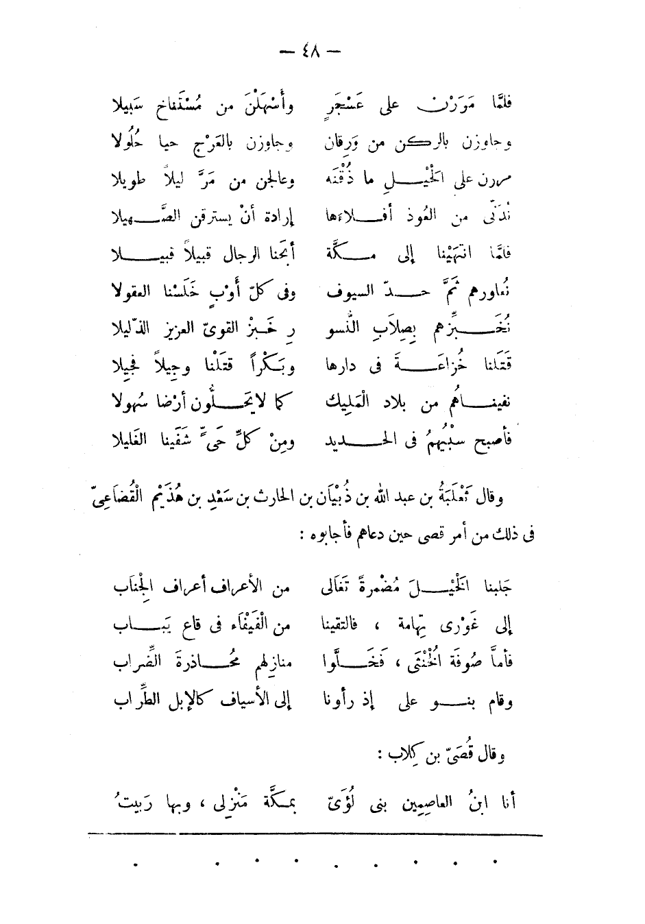 وَقَالَ ثَعْلَبَةُ بْنُ عَبْدِ اللهِ بْنِ ذُبْيَانَ بن الجارث بن سعد بن هُذَيْمٍ الْقُضَاعِيّ فِي ذَلِكَ مِنْ أَمْرِ قُصَيّ حِينَ دَعَاهُمْ فَأَجَابُوهُ: