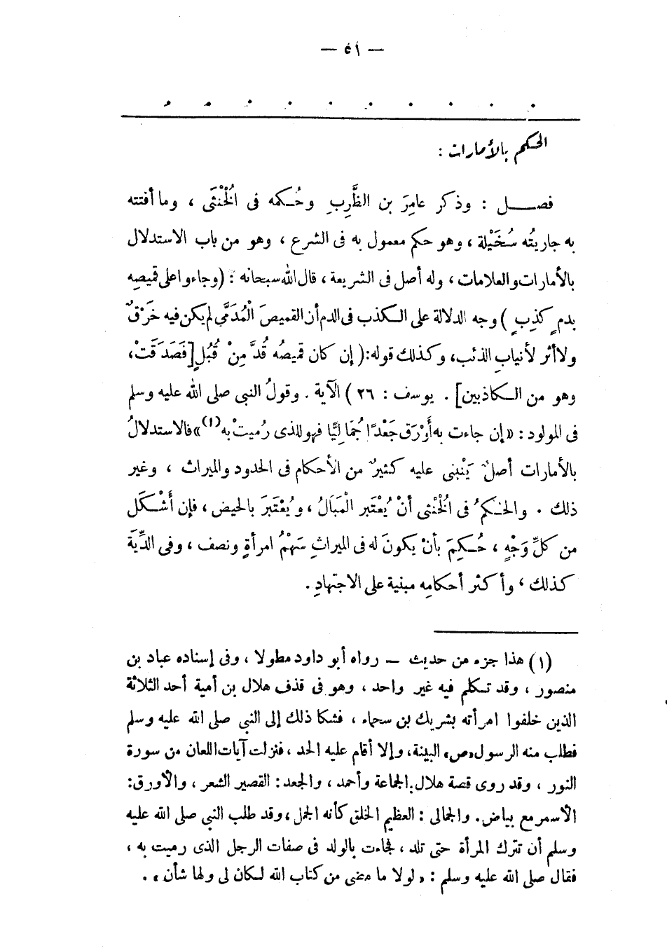 فَصْلٌ: وَذَكَرَ عَامِرُ بْنُ الظّرِبِ وَحُكْمُهُ فِي الْخُنْثَى، وَمَا أَفْتَتْهُ بِهِ جَارِيَتُهُ سُخَيْلَةُ، وَهُوَ حُكْمٌ مَعْمُولٌ بِهِ فِي الشّرْعِ، وَهُوَ مِنْ بَابِ الِاسْتِدْلَالِ بِالْأَمَارَاتِ وَالْعَلَامَاتِ، وَلَهُ أصل فى الشريعة، قال الله سبحانه: (وجاؤا على قميصه بدم كذب) وَجْهُ الدّلَالَةِ عَلَى الْكَذِبِ فِي الدّمِ أَنّ الْقَمِيصَ الْمُدْمَى لَمْ يَكُنْ فِيهِ خَرْقٌ وَلَا أَثَرٌ لِأَنْيَابِ الذّئْبِ، وَكَذَلِكَ قَوْلُهُ: (إِنْ كَانَ قَمِيصُهُ قُدّ مِنْ قُبُلٍ [فَصَدَقَتْ، وَهُوَ مِنَ الْكَاذِبِينَ] . يُوسُفَ: 26) الْآيَةَ. وَقَوْلُ النّبِيّ صَلَّى اللَّهُ عَلَيْهِ وَسَلَّمَ فِي الْمَوْلُودِ: «إنْ جَاءَتْ بِهِ أَوْرَقَ جَعْدًا جُمَالِيّا فَهُوَ لِلّذِي رُمِيَتْ بِهِ «1» » فَالِاسْتِدْلَالُ بِالْأَمَارَاتِ أَصْلٌ يَنْبَنِي عَلَيْهِ كَثِيرٌ مِنْ الْأَحْكَامِ فِي الْحُدُودِ وَالْمِيرَاثِ، وَغَيْرِ ذَلِكَ. وَالْحُكْمُ فِي الْخُنْثَى أَنْ يُعْتَبَرَ الْمَبَالُ، وَيُعْتَبَرَ بِالْحَيْضِ، فَإِنْ أَشْكَلَ مِنْ كُلّ وَجْهٍ، حُكِمَ بِأَنْ يَكُونَ لَهُ فِي الْمِيرَاثِ سَهْمُ امْرَأَةٍ وَنِصْفٌ، وَفِي الدّيَةِ كَذَلِكَ، وَأَكْثَرُ أَحْكَامِهِ مَبْنِيّةٌ عَلَى الاجتهاد.
