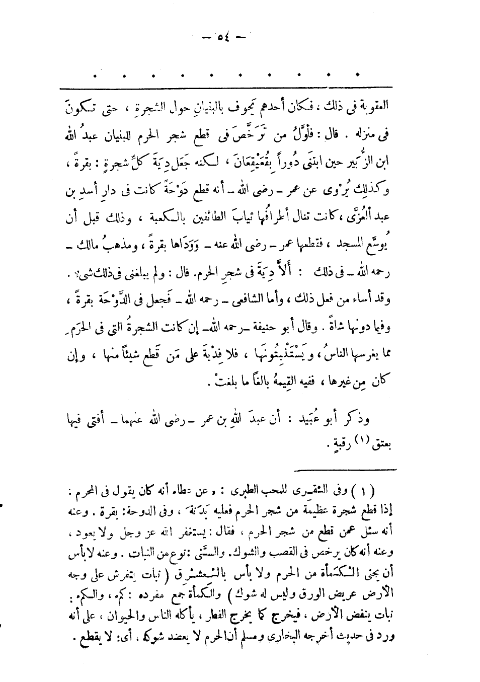 (1) وفى الثقرى للمحب الطبرى: «عن عطاء أنه كان يقول فى المحرم: إذا قطع شجرة عظيمة من شجر الحرم فعليه بدنة، وفى الدوحة: بقرة. وعنه أنه سئل عمن قطع من شجر الحرم، فقال: يستغفر الله عز وجل ولا يعود، وعنه أنه كان يرخص فى القصب والشوك. والسّنى: نوع من النبات. وعنه لا بأس أن يجنى الكمأة من الحرم ولا بأس بالسعشرق (نبات يتفرش على وجه الأرض عريض الورق وليس له شوك) والكمأة جمع مفرده: كمء، والكمء: نبات ينفض الأرض، فيخرج كما يخرج الفطر، يأكله الناس والحيوان، على أنه ورد فى حديث أخرجه البخارى ومسلم أن الحرم لا يعضد شوكه، أى: لا يقطع.
