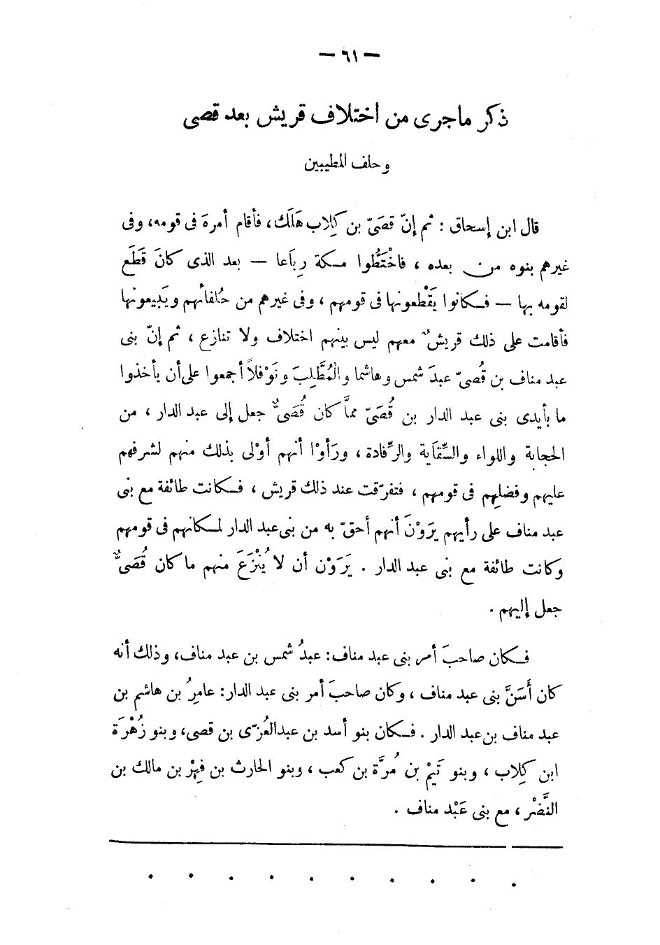 قَالَ ابْنُ إسْحَاقَ: ثُمّ إنّ قُصَيّ بْنَ كِلَابٍ هَلَكَ، فَأَقَامَ أَمْرَهُ فِي قَوْمِهِ، وَفِي غَيْرِهِمْ بَنُوهُ مِنْ بَعْدِهِ، فَاخْتَطّوا مَكّةَ رِبَاعًا- بعد الذى كان قطع لقومه بها- فَكَانُوا يَقْطَعُونَهَا فِي قَوْمِهِمْ، وَفِي غَيْرِهِمْ مِنْ حُلَفَائِهِمْ وَيَبِيعُونَهَا فَأَقَامَتْ عَلَى ذَلِكَ قُرَيْشٌ مَعَهُمْ لَيْسَ بَيْنَهُمْ اخْتِلَافٌ وَلَا تَنَازُعٌ، ثُمّ إنّ بَنِي عَبْدِ مَنَافِ بْنِ قُصَيّ عَبْدَ شَمْسٍ وَهَاشِمًا وَالْمُطّلِبَ وَنَوْفَلًا أَجَمَعُوا عَلَى أَنْ يَأْخُذُوا مَا بِأَيْدِي بَنِي عَبْدِ الدّارِ بْنِ قُصَيّ مِمّا كَانَ قُصَيّ جَعَلَ إلَى عَبْدِ الدّارِ، مِنْ الْحِجَابَةِ وَاللّوَاءِ وَالسّقَايَةِ وَالرّفَادَةِ، وَرَأَوْا أَنّهُمْ أَوْلَى بِذَلِكَ مِنْهُمْ لِشَرَفِهِمْ عَلَيْهِمْ وَفَضْلِهِمْ فِي قَوْمِهِمْ، فَتَفَرّقَتْ عِنْدَ ذَلِكَ قُرَيْشٌ، فَكَانَتْ طَائِفَةٌ مَعَ بَنِي عَبْدِ مَنَافٍ عَلَى رَأْيِهِمْ يَرَوْنَ أَنّهُمْ أَحَقّ بِهِ مِنْ بَنِي عَبْدِ الدّارِ لِمَكَانِهِمْ فِي قَوْمِهِمْ وَكَانَتْ طَائِفَةٌ مَعَ بَنِي عَبْدِ الدّارِ. يَرَوْنَ أَنْ لَا يُنْزَعَ مِنْهُمْ ما كان قصىّ جعل إليهم.