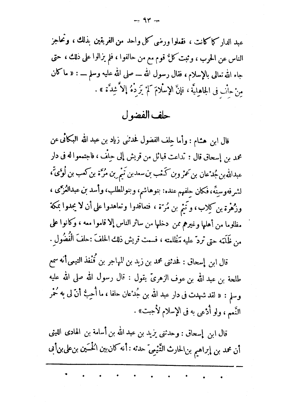 قَالَ ابْنُ إسْحَاقَ: فَحَدّثَنِي مُحَمّدُ بْنُ زَيْدِ بْنِ الْمُهَاجِرِ بْنِ قُنْفُذٍ التّيْمِيّ أَنّهُ سَمِعَ طَلْحَةَ بْنَ عَبْدِ اللهِ بْنِ عَوْفِ الزّهْرِيّ يَقُولُ: قَالَ رَسُولُ اللهِ صَلَّى اللَّهُ عَلَيْهِ وَسَلَّمَ: «لَقَدْ شَهِدْت فِي دَارِ عَبْدِ اللهِ بْنِ جُدْعَانَ حِلْفًا، مَا أُحِبّ أَنّ لِي بِهِ حُمْرَ النّعَمِ، وَلَوْ أُدْعَى بِهِ فِي الإسلام لأجبت» .