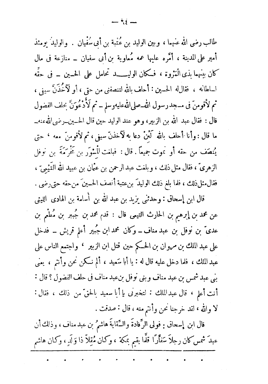 طَالِبٍ رَضِيَ اللهُ عَنْهُمَا، وَبَيْنَ الْوَلِيدِ بْنِ عُتْبَةَ بْنِ أَبِي سُفْيَانَ. وَالْوَلِيدُ يَوْمَئِذٍ أَمِيرٌ عَلَى الْمَدِينَةِ، أَمّرَهُ عَلَيْهَا عَمّهُ مُعَاوِيَةُ بْنُ أبى سفيان- مُنَازَعَةً فِي مَالٍ كَانَ بَيْنَهُمَا بِذِي الْمَرْوَةِ، فكان الوليد تحامل على الحسين- فِي حَقّهِ لِسُلْطَانِهِ، فَقَالَ لَهُ الْحُسَيْنُ: أَحْلِفُ بِاَللهِ لَتُنْصِفَنّي مِنْ حَقّي، أَوْ لَآخُذَن سَيْفِي، ثُمّ لَأَقُومَن فِي مَسْجِدِ رَسُولِ اللهِ- صَلَّى اللَّهُ عَلَيْهِ وَسَلّمَ- ثُمّ لَأَدْعُوَن بِحِلْفِ الْفُضُولِ قَالَ: فَقَالَ عَبْدُ اللهِ بْنُ الزّبَيْرِ، وَهُوَ عِنْدَ الْوَلِيدِ حِينَ قَالَ الْحُسَيْنُ- رَضِيَ الله عَنْهُ- مَا قَالَ: وَأَنَا أَحْلِفُ بِاَللهِ لَئِنْ دَعَا بِهِ لَآخُذَن سَيْفِي، ثُمّ لَأَقُومَن مَعَهُ، حَتّى يُنْصَفَ مِنْ حَقّهِ أَوْ نَمُوتَ جَمِيعًا. قَالَ: فَبَلّغْت الْمِسْوَرَ بْنَ مَخْرَمَةَ بْنَ نَوْفَلٍ الزّهْرِيّ، فَقَالَ مِثْلَ ذَلِكَ، وَبَلّغْت عَبْدَ الرّحْمَنِ بْنَ عُثْمَانَ بْنِ عُبَيْدِ اللهِ التّيْمِيّ، فَقَالَ مِثْلَ ذَلِكَ، فَلَمّا بَلَغَ ذَلِكَ الْوَلِيدَ بْنَ عُتْبَةَ أَنْصَفَ الْحُسَيْنَ مِنْ حَقّهِ حَتّى رَضِيَ.