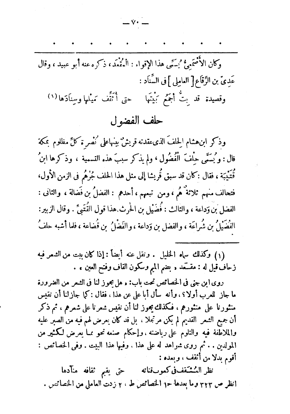 (1) وكذلك سماه الخليل. ونقل عنه أيضا: إذا كان بيت من الشعر فيه زحاف قيل له: مقعد «بضم الميم وسكون القاف وفتح العين» . روى ابن جنى فى الخصائص تحت باب: «هل يجوز لنا فى الشعر من الضرورة ما جاز للعرب أولا؟، وأنه سأل أبا على عن هذا، فقال: كما جازلنا أن نقيس منثورنا على منثورهم، فكذلك يجوز لنا أن نقيس شعرنا على شعرهم، ثم ذكر أن جميع الشعر القديم لم يكن مرتجلا، بل قد كان يعرض لهم فيه من الصبر عليه والملاطفة فيه والتلوم على رياضته، وإحكام صنعه نحو مما يعرض لكثير من المولدين.. ثم روى شواهد له على هذا، وفيها هذا البيت. وفى الخصائص: أقوم بدلا من أثقف، وبعده: