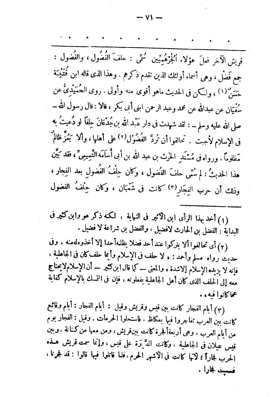 جَمْعُ فَضْلٍ، وَهِيَ أَسْمَاءُ أُولَئِكَ الّذِينَ تَقَدّمَ ذِكْرُهُمْ. وَهَذَا الّذِي قَالَهُ ابْنُ قُتَيْبَةَ حَسَنٌ «1» ، وَلَكِنْ فِي الْحَدِيثِ مَا هُوَ أَقْوَى مِنْهُ وَأَوْلَى. رَوَى الْحُمَيْدِيّ عَنْ سُفْيَانَ عَنْ عَبْدِ اللهِ عَنْ مُحَمّدٍ وَعَبْدِ الرّحْمَنِ ابْنَيْ أَبِي بَكْرٍ، قَالَا: قَالَ رَسُولُ اللهِ- صَلَّى اللَّهُ عَلَيْهِ وَسَلَّمَ-: لَقَدْ شَهِدْت فِي دَارِ عَبْدِ اللهِ بْنِ جُدْعَانَ حِلْفًا لَوْ دُعِيت بِهِ فِي الْإِسْلَامِ لَأَجَبْت. تَحَالَفُوا أَنْ تُرَدّ الْفُضُولُ «2» عَلَى أَهْلِهَا، وَأَلّا يَعُزّ ظَالِمٌ مظلوما. ورواه فى مسند الحرث بْنِ عَبْدِ اللهِ بْنِ أَبِي أُسَامَةَ التّمِيمِيّ، فَقَدْ بَيّنَ هَذَا الْحَدِيثَ: لِمَ سُمّيَ حِلْفَ الْفُضُولِ، وَكَانَ حِلْفُ الْفُضُولِ بَعْدَ الْفُجّارِ، وَذَلِكَ أَنّ حَرْبَ الْفُجّارِ «3» كَانَتْ فِي شَعْبَانَ، وَكَانَ حلف الفضول