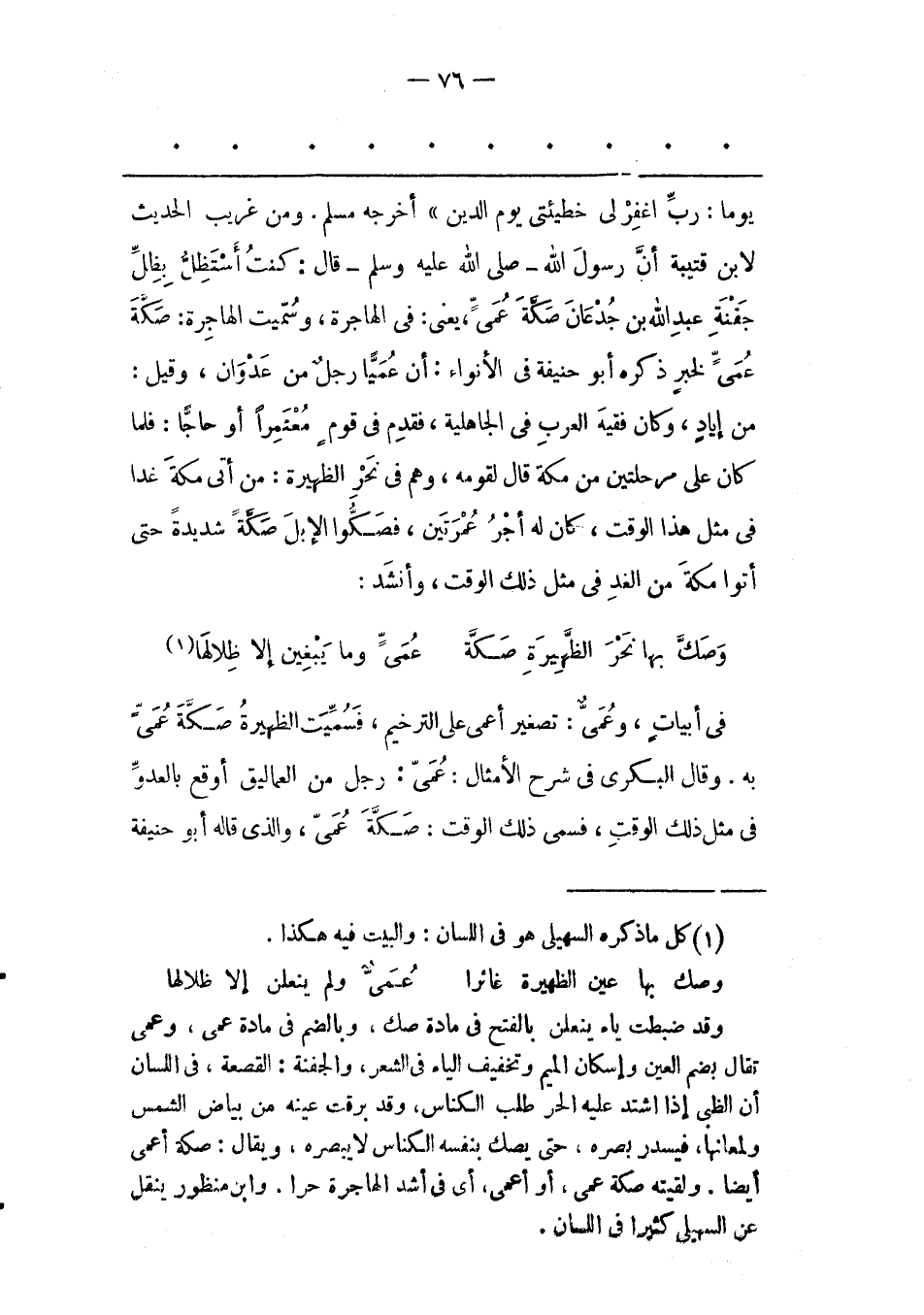 يوما: ربّ اغفرلى خَطِيئَتِي يَوْمَ الدّينِ» أَخْرَجَهُ مُسْلِمٌ. وَمِنْ غَرِيبِ الْحَدِيثِ لِابْنِ قُتَيْبَةَ أَنّ رَسُولَ اللهِ- صَلَّى اللَّهُ عَلَيْهِ وَسَلَّمَ- قَالَ: كُنْت أَسَتَظِلّ بِظِلّ جَفْنَةِ عَبْدِ اللهِ بْنِ جُدْعَانَ صَكّةَ عُمَيّ، يَعْنِي: فِي الْهَاجِرَةِ، وَسُمّيَتْ الْهَاجِرَةُ: صَكّةَ عُمَيّ لِخَبَرِ ذَكَرَهُ أَبُو حَنِيفَةَ فِي الْأَنْوَاءِ: أَنّ عُمَيّا رَجُلٌ مِن عَدْوَانَ، وَقِيلَ: