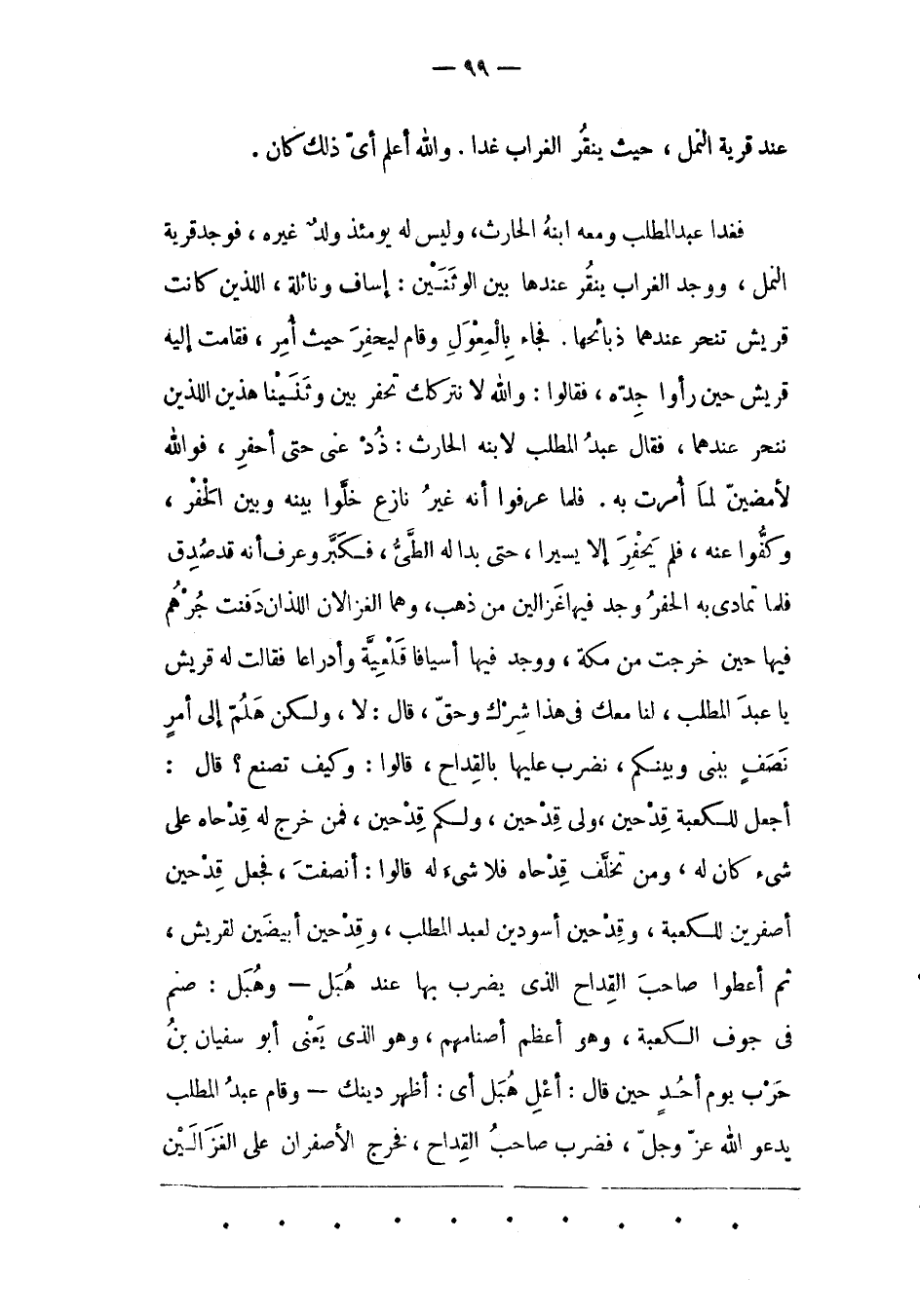 فغدا عَبْدُ الْمُطّلِبِ وَمَعَهُ ابْنُهُ الْحَارِثُ، وَلَيْسَ لَهُ يَوْمَئِذٍ وَلَدٌ غَيْرَهُ، فَوَجَدَ قَرْيَةَ النّمْلِ، وَوَجَدَ الْغُرَابَ يَنْقُرُ عِنْدَهَا بَيْنَ الْوَثَنَيْنِ: إسَافٍ وَنَائِلَةٍ، اللّذَيْنِ كَانَتْ قُرَيْشٌ تَنْحَرُ عِنْدَهُمَا ذَبَائِحَهَا. فَجَاءَ بِالْمِعْوَلِ وَقَامَ لِيَحْفِرَ حَيْثُ أُمِرَ، فَقَامَتْ إلَيْهِ قُرَيْشٌ حِينَ رَأَوْا جِدّهُ، فَقَالُوا: وَاَللهِ لَا نَتْرُكُك تَحْفِرُ بَيْنَ وَثَنَيْنَا هَذَيْنِ اللّذَيْنِ نَنْحَرُ عِنْدَهُمَا، فَقَالَ عَبْدُ الْمُطّلِبِ لِابْنِهِ الْحَارِثِ: ذُدْ عنى حتى أحفر، فو الله لَأَمْضِيَن لِمَا أُمِرْت بِهِ. فَلَمّا عَرَفُوا أَنّهُ غَيْرُ نَازِعٍ خَلّوْا بَيْنَهُ وَبَيْنَ الْحَفْرِ، وَكَفّوا عَنْهُ، فَلَمْ يَحْفِرْ إلّا يَسِيرًا، حَتّى بَدَا له الطّىّ، فكبّر وعرف أَنّهُ قَدْ صُدِقَ فَلَمّا تَمَادَى بِهِ الْحَفْرُ وَجَدَ فِيهَا غَزَالَيْنِ مِنْ ذَهَبٍ، وَهُمَا الْغَزَالَانِ اللّذَانِ دَفَنَتْ جُرْهُمٌ فِيهَا حِينَ خَرَجَتْ مِنْ مَكّةَ، وَوَجَدَ فِيهَا أَسْيَافًا قَلْعِيّةً وَأَدْرَاعًا فَقَالَتْ لَهُ قُرَيْشٌ يَا عَبْدَ الْمُطّلِبِ، لَنَا مَعَك فِي هَذَا شِرْكٌ وَحَقّ، قَالَ: لَا، وَلَكِنْ هلمّ إلى أمر نصف ببنى وَبَيْنَكُمْ، نَضْرِبُ عَلَيْهَا بِالْقِدَاحِ، قَالُوا: وَكَيْفَ تَصْنَعُ؟ قال: