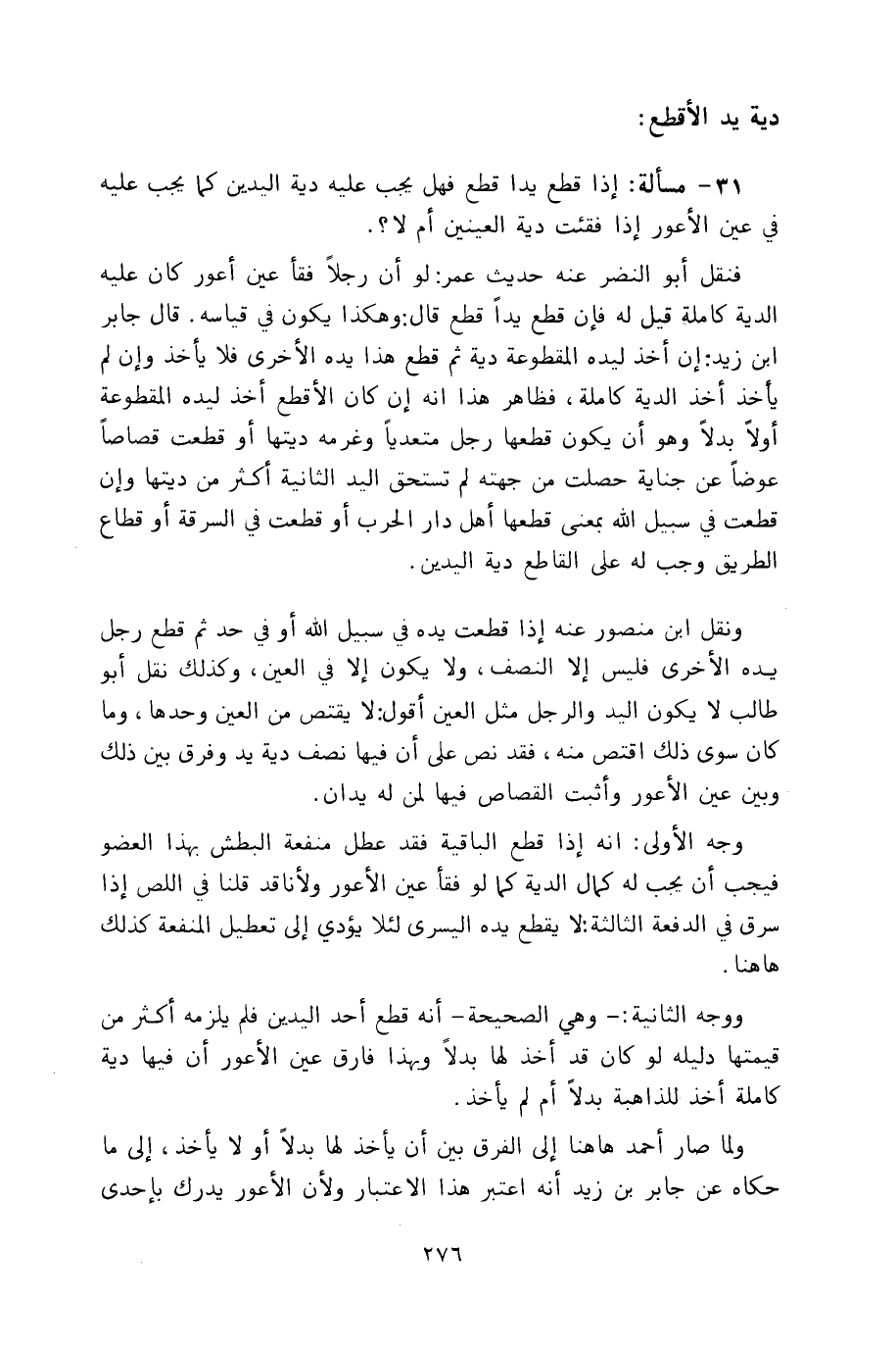 فنقل أبو النضر عنه حديث عمر: لو أن رجلاً فقأ عين أعور كان عليه الدية كاملة قيل له فإن قطع يداً قطع قال: وهكذا يكون في قياسه. قال جابر ابن زيد: إن أخذ ليده المقطوعة دية ثم قطع هذا يده الأخرى فلا يأخذ وإن لم يأخذ أخذ الدية كاملة، فظاهر هذا أنه إن كان الأقطع أخذ ليده المقطوعة أولاً بدلاً وهو أن يكون قطعها رجل متعدياً وغرمه ديتها أو قطعت قصاصاً عوضاً عن جناية حصلت من جهته لم تستحق اليد الثانية أكثر من ديتها وإن قطعت في سبيل الله بمعنى قطعها أهل دار الحرب أو قطعت في السرقة أو قطاع الطريق وجب له على القاطع دية اليدين.