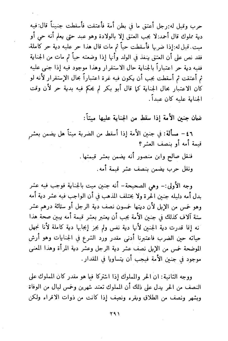٤٦ - مسألة: في جنين الأمة إذا أسقط من الضربة ميتاً هل يضمن بعشر قيمة أمه أو بنصف العشر؟