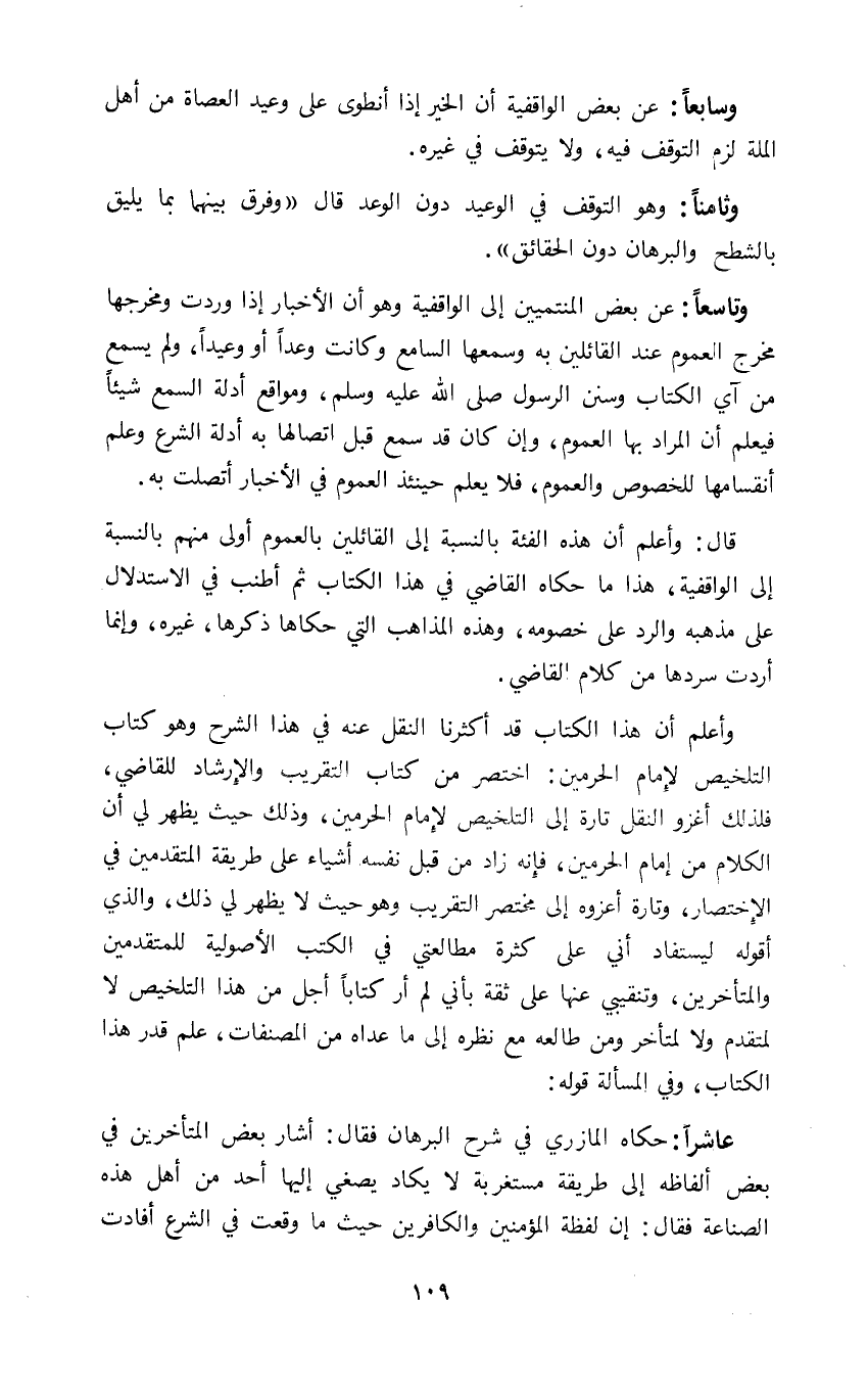 قال: واعلم ان هذه الفئة بالنسبة إلى القائلين بالعموم أولى منهم بالنسبة إلى الواقفية هذا ما حكاه القاضي في هذا الكتاب ثم أطنب في الاستدلال على مذهبه والرد على خصومه وهذه المذاهب التي حكاها ذكرها غيره وانما أردت سردها من كلام القاضي.