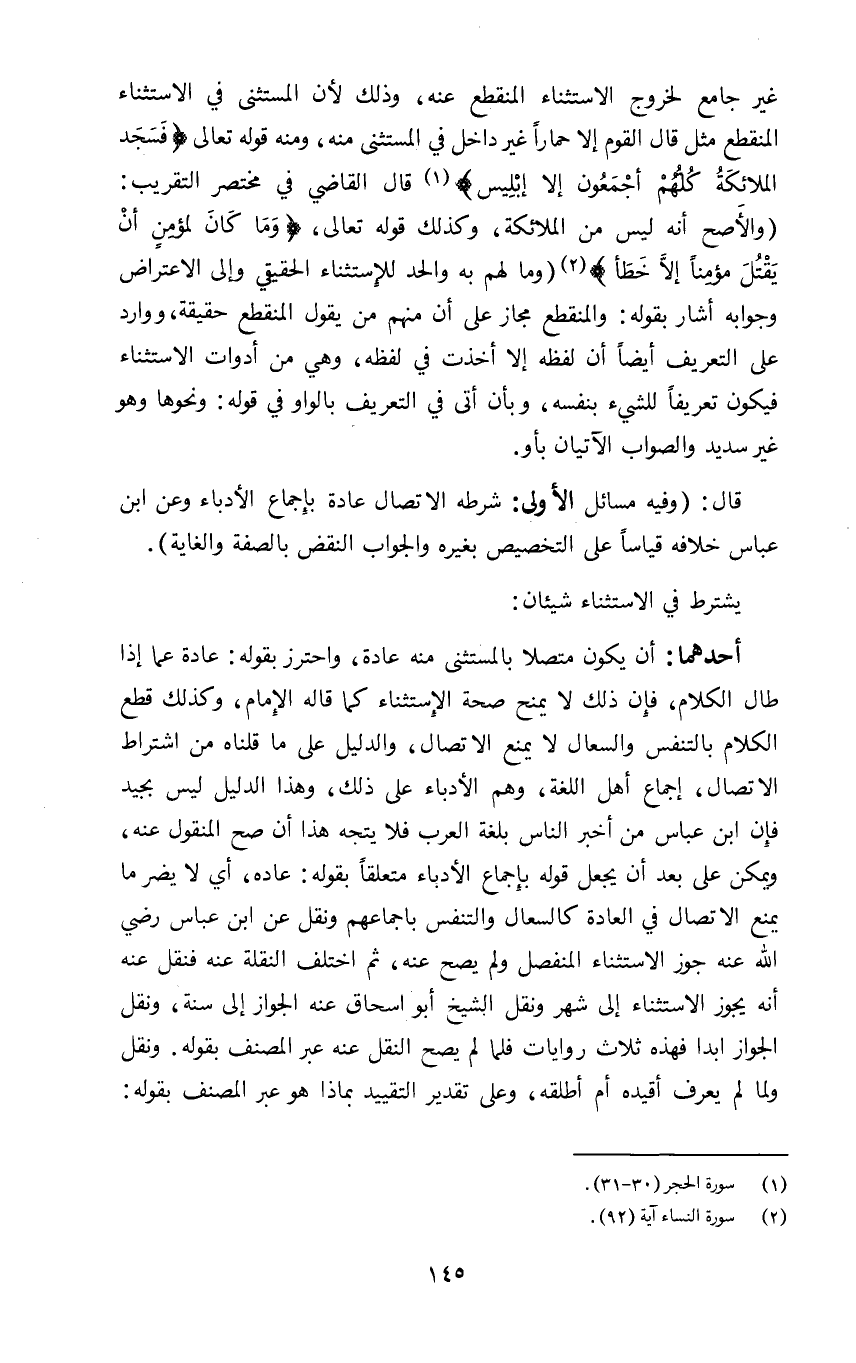 أحدهما: ان يكون متصلا بالمستثنى منه عادة واحترز بقوله عادة عما إذا طال الكلام فإن ذلك لا يمنح صحة الإستثناء كما قاله الإمام وكذلك قطع الكلام بالتنفس والسعال لا يمنع الاتصال والدليل على ما قلناه من اشتراط الاتصال إجماع أهل اللغة وهم الأدباء عل ذلك وهذا الدليل ليس بجيد فإن ابن عباس من أخبر الناس بلغة العرب فلا يتجه هذا ان صح المنقول عنه ويمكن على بعد ان يجعل قوله بإجماع الأدباء متعلقا بقوله عاده أي لا يضر ما يمنع الاتصال في العادة كالسعال والتنفس باجماعهم ونقل عن ابن عباس رضي الله عنه جوز الاستثناء المنفصل ولم يصح عنه ثم اختلف النقلة عنه فنقل عنه انه يجوز الاستثناء الى شهر ونقل الشيخ أبو اسحاق عنه الجواز إلى سنة ونقل الجواز ابدا فهذه ثلاث روايات فلما لم يصح النقل عنه عبر المصنف بقوله ونقل ولما لم يعرف أقيده أم أطلقه وعلى تقدير التقييد بماذا هو عبر المصنف بقوله: