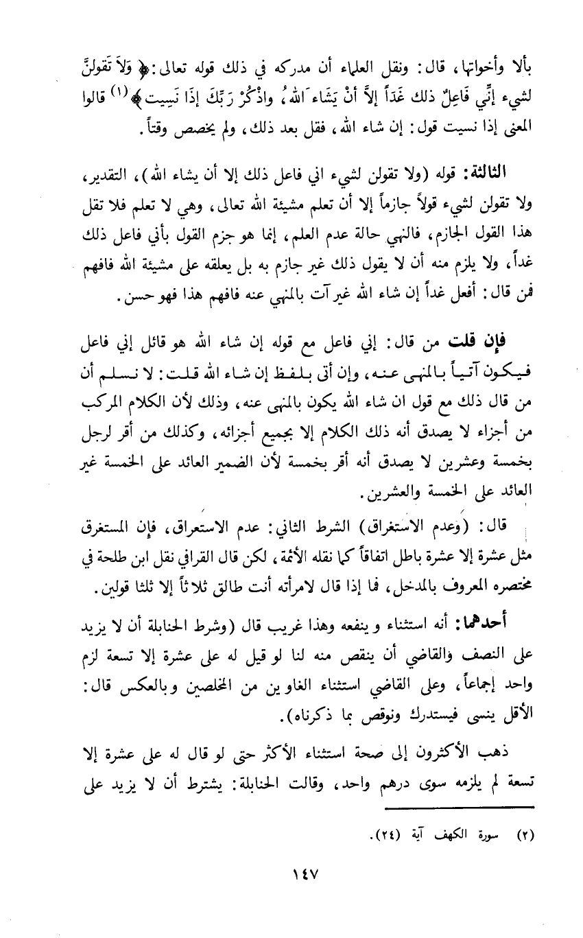 فإن قلت من قال: إني فاعل مع قوله إن شاء الله هو قائل إني فاعل فيكون آتيا بالمنهي عنه وإن أتى بلفظ إن شاء الله قلت لا نسلم أن من قال ذلك مع قول إن شاء الله يكون بالمنهي عنه وذلك لأن الكلام المركب من أجزاء لا يصدق أنه ذلك الكلام إلا من جميع أجزائه وكذلك من اقر لرجل بخمسة وعشرين لا يصدق أنه أقر بخمسة لأن الضمير العائد على الخمسة غير العائد على الخمسة والعشرين.