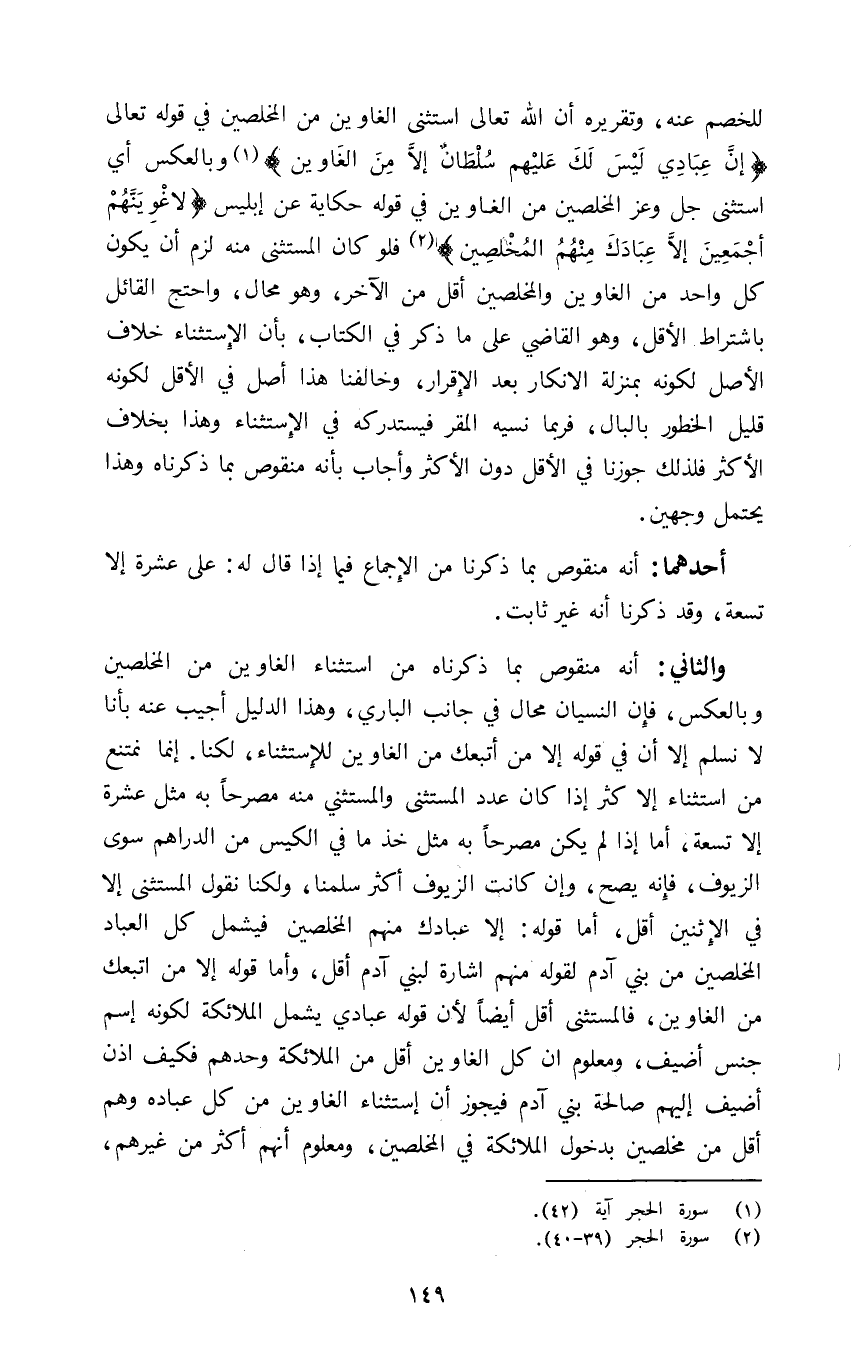 والثاني: أنه منقوص بما ذكرناه من استثناء الغاوين من المخلصين وبالعكس فإن النسيان محال في جانب الباري وهذا الدليل أجيب عنه بأنا لا نسلم إلا أن في قوله إلا من اتبعك من الغاوين للاستثناء لكنا إنما نمتنع من استثناء إلا كثر إذا كان عدد المستثنى والمستثني منه مصرحا به مثل عشرة إلا تسعة أما إذا لم يكن مصرحا به مثل خذ ما في الكيس من الدراهم سوى الزيوف فإنه يصح وإن كانت الزيوف أكثر سلمنا ولكنا نقول المستثنى إلا في الإثنين أقل أما قوله إلا عبادك منهم المخلصين فيشمل كل العباد المخلصين من بني آدم لقوله منهم إشارة لبني آدم اقل واما قوله الا من اتبعك من الغاوين فالمستثنى اقل ايضا لأن قوله عبادي يشمل الملائكة لكونه إسم جنس أضيف ومعلوم ان كل الغاوين أقل من الملائكة وحدهم فكيف إذن أضيف إليهم صالحة بني آدم فيجوز ان استثناء الغاوين من كل عباده وهم اقل من مخلصين بدخول الملائكة في المخلصين ومعلوم انهم اكثر من غيرهم