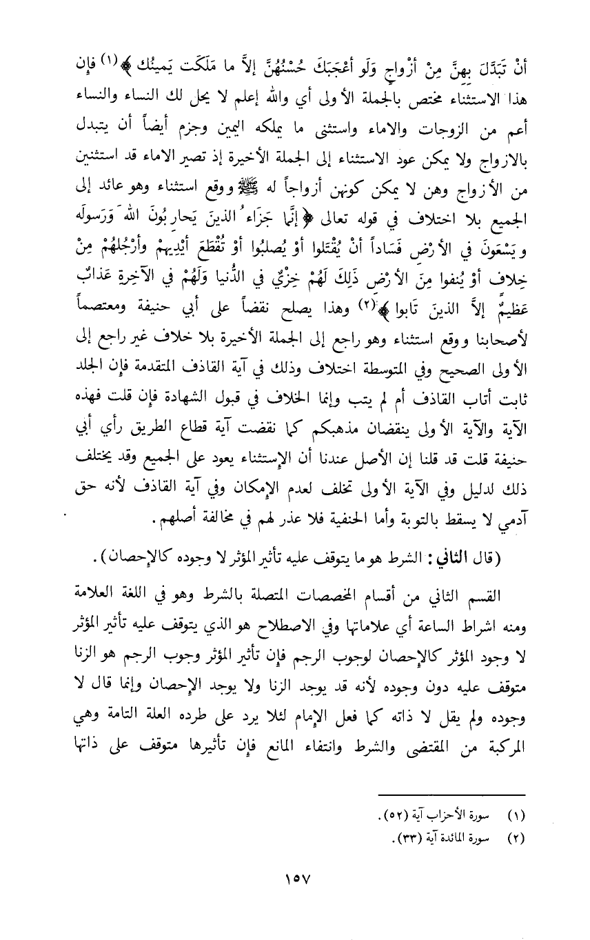 أَنْ تَبَدَّلَ بِهِنَّ مِنْ أَزْوَاجٍ وَلَوْ أَعْجَبَكَ حُسْنُهُنَّ إِلَّا مَا مَلَكَتْ يَمِينُكَ} ١ فان هذا الاستثناء مختص بالجملة الأولى أي والله إعلم لا يحل لك النساء والنساء اعم من الزوجات والإماء واستثنى ما يملكه اليمين وجزم أيضا أن يتبدل بالأزواج ولا يمكن عود الاستثناء إلى الجملة الأخيرة إذ تصير الإماء قد استثنين من الأزواج وهن لا يمكن كونهن أزواجا له صلى الله عليه وسلم ووقع استثناء وهو عائد إلى الجميع بلا اختلاف في قوله تعالى: {إِنَّمَا جَزَاءُ الَّذِينَ يُحَارِبُونَ اللَّهَ وَرَسُولَهُ وَيَسْعَوْنَ فِي الْأَرْضِ فَسَاداً أَنْ يُقَتَّلُوا أَوْ يُصَلَّبُوا أَوْ تُقَطَّعَ أَيْدِيهِمْ وَأَرْجُلُهُمْ مِنْ خِلافٍ أَوْ يُنْفَوْا مِنَ الْأَرْضِ ذَلِكَ لَهُمْ خِزْيٌ فِي الدُّنْيَا وَلَهُمْ فِي الْآخِرَةِ عَذَابٌ عَظِيمٌ إِلَّا الَّذِينَ تَابُوا} ٢ وهذا يصلح نقضا على أبى حنيفة ومعتصما لأصحابنا ووقع استثناء وهو راجع إلى الجملة الأخيرة بلا خلاف غير راجع إلى الأولى الصحيح وفي المتوسطة اختلاف وذلك في آية القاذف المتقدمة فان الجلد ثابت اتاب القاذف أم لم يتب وإنما الخلاف في قبول الشهادة فإن قلت فهذه الآية والآية الأولى ينقضان مذهبكم كما نقضت آية قطاع الطريق رأي أبى حنيفة قلت قد قلنا ان الأصل عندنا ان الاستثناء يعود على الجميع وقد يختلف ذلك لدليل في الآية الأولى تخلف لعدم الإمكان وفي آية القاذف لأنه حق آدمي لا يسقط بالتوبة وأما الحنفية فلا عذر لهم في مخالفة أصلهم.