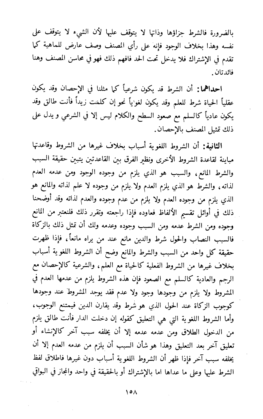 إحداهما: ان الشرط قد يكون شرعيا كما مثلنا في الإحصان وقد يكون عقليا الحياة شرط للعلم وقد يكون لغويا نحو ان كلمت زيدا فأنت طالق وقد يكون عاديا كالسلم مع صعود السطح والكلام ليس إلا في الشرعي ويدل على ذلك تمثيل المصنف بالإحصان.