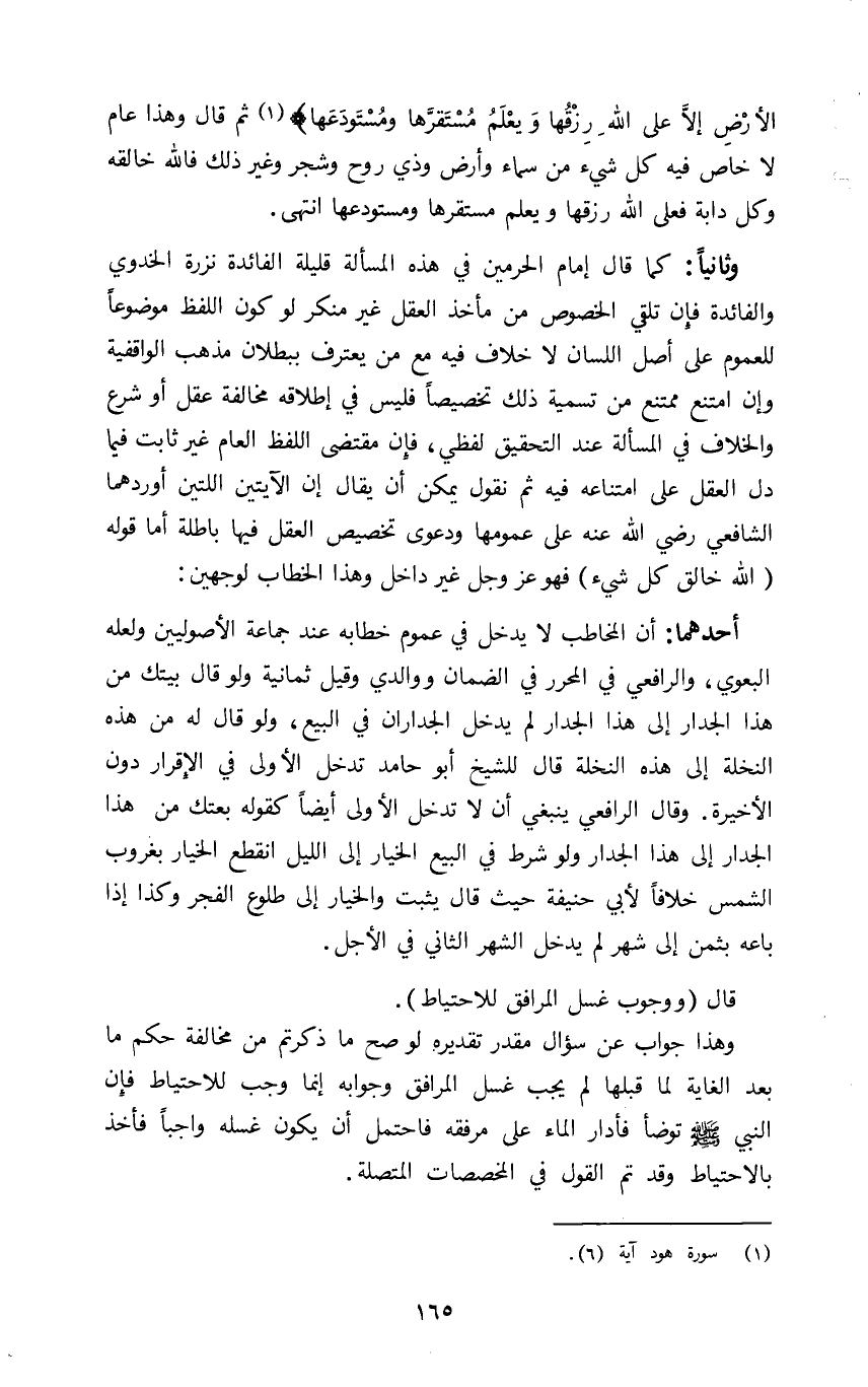 ثانيا: كما قال إمام الحرمين في هذه المسألة قليلة الفائدة نزرة الخدوي والفائدة فإن تلقى الخصوص من مأخذ العقل غير منكر لو كون اللفظ موضوعا للعموم على اصل اللسان لا خلاف فيه مع من يعترف ببطلان مذهب الواقفية وإن امتنع ممتنع من تسمية ذلك تخصيصا فليس في إطلاقه مخالفة عقل أو شرع والخلاف في المسألة عند التحقيق لفظي فان مقتضى اللفظ العام غير ثابت فيما دل العقل على امتناعه فيه ثم نقول يمكن ان يقال ان الآيتين اللتين أوردهما الشافعي رضي الله عنه على عمومها ودعوى تخصيص العقل فيها باطلة أما قوله: {اللَّهُ خَالِقُ كُلِّ شَيْءٍ} فهو عز وجل غير داخل وهذا الخطاب لوجهين: