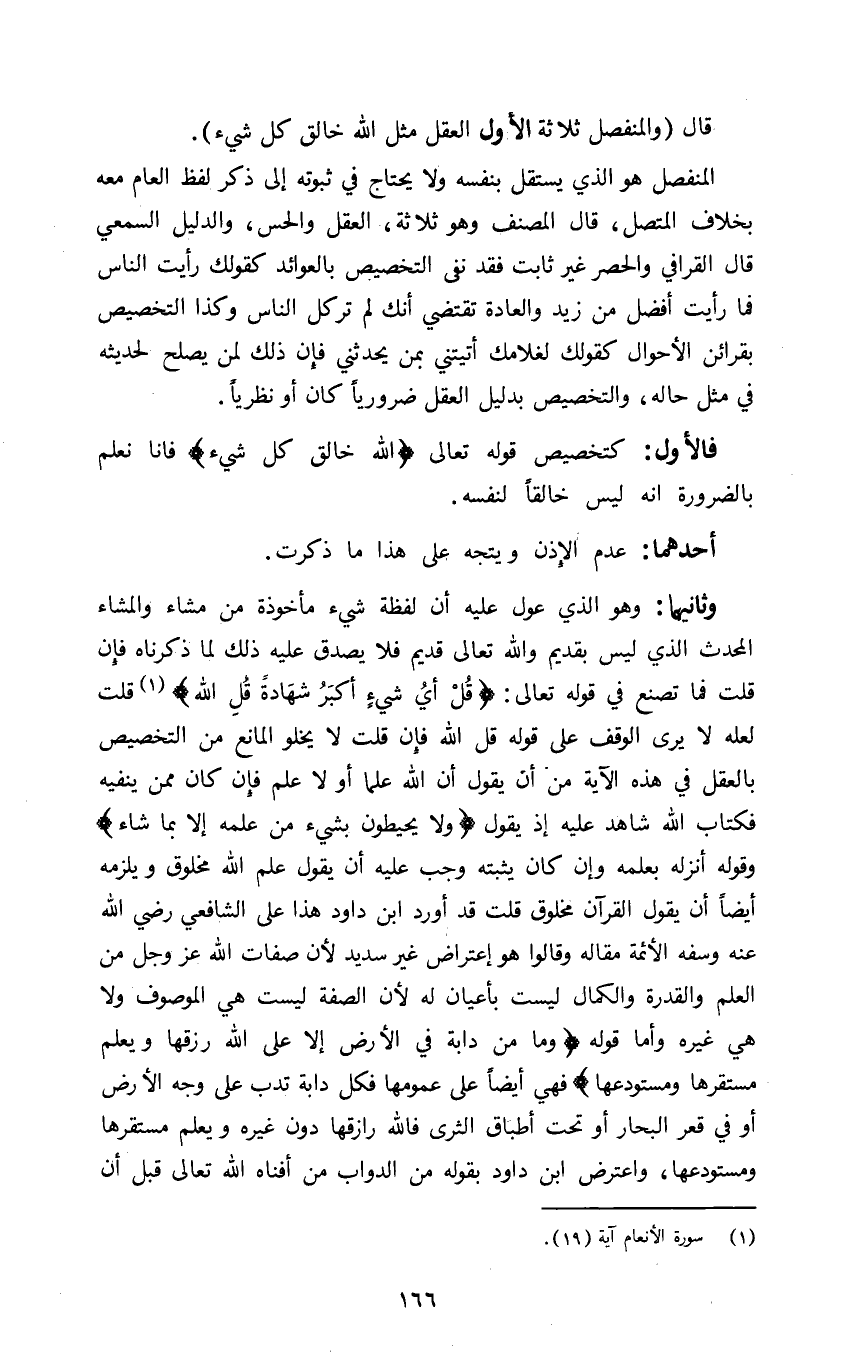 وثانيهما: وهو الذي عول عليه ان لفظة شيء مأخوذه من مشاء والمشاء المحدث الذي ليس بقديم والله تعالى قديم فلا يصدق عليه ذلك لما ذكرناه فان قلت فما تصنع في قوله تعالى: {قُلْ أَيُّ شَيْءٍ أَكْبَرُ شَهَادَةً قُلِ اللَّهُ} ١ قلت لعله لا يرى الوقف على قول قل الله فإن قلت لا يخلو المانع من التخصيص بالعقل في هذه الآية من ان يقول أن الله علما أو لا علم فإن كان ممن ينفيه فكتاب الله شاهد عليه إذ يقول: {وَلا يُحِيطُونَ بِشَيْءٍ مِنْ عِلْمِهِ إِلَّا بِمَا شَاءَ} وقوله: {أَنْزَلَهُ بِعِلْمِهِ} وإن كان يثبته وجب عليه أن يقول علم الله مخلوق ويلزمه أيضا ان يقول القرآن مخلوق قلت قد أورد ابن داود هذا على الشافعي رضي الله عنه وسفه الأئمة مقاله وقالوا هو اعتراض غير سديد لأن صفات الله عز وجل من العلم والقدرة والكمال ليست بأعيان له لأن الصفة ليست هي الموصوف ولا هي غيره وأما قوله: {وَمَا مِنْ دَابَّةٍ فِي الْأَرْضِ إِلَّا عَلَى اللَّهِ رِزْقُهَا وَيَعْلَمُ مُسْتَقَرَّهَا وَمُسْتَوْدَعَهَا} فهي أيضا على عمومها فكل دابة تدب على وجه الأرض أو في قعر البحار أو تحت أطباق الثرى فالله رازقها دون غيره ويعلم مستقرها ومستودعها واعترض ابن داود بقوله من الدواب من أفناه الله تعالى قبل أن