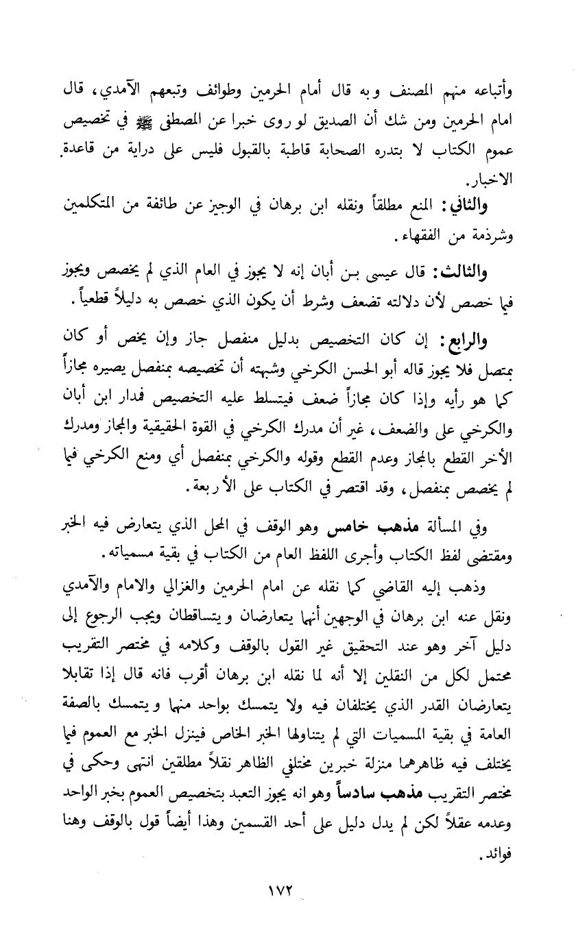 وفي المسألة مذهب خامس وهو الوقف في المحل الذي يتعارض فيه الخبر ومقتضى لفظ الكتاب وأجرى اللفظ العام من الكتاب في بقية مسمياته.