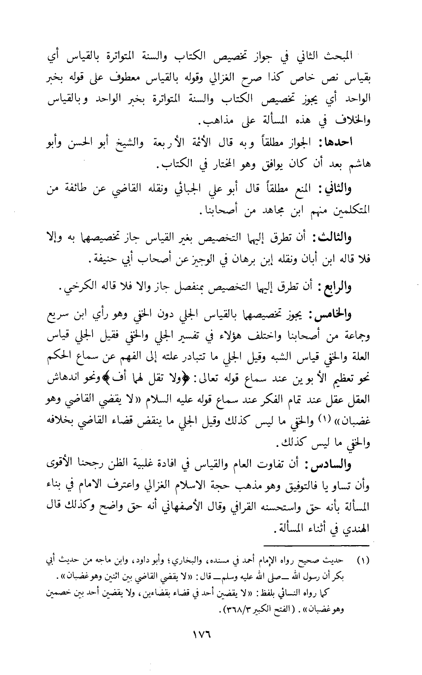 والخامس: يجوز تخصيصهما بالقياس الجلي دون الخفي وهو رأي ابن سريع وجماعة من أصحابنا واختلف هؤلاء في تفسير الجلي والخفي فقيل الجلي قياس العلة والخفي قياس الشبه وقيل الجلي ما تتبادر علته إلى الفهم عن سماع الحكم نحو تعظيم الأبوين عند سماع قوله تعالى: {فَلا تَقُلْ لَهُمَا أُفٍّ} ونحو اندهاش العقل عقل عند تمام الفكر عند سماع قوله عليه السلام: "لا يقضي القاضي وهو غضبان" ١ والخفي ما ليس كذلك وقيل الجلي ما ينقض قضاء القاضي بخلافه والخفي ما ليس كذلك.