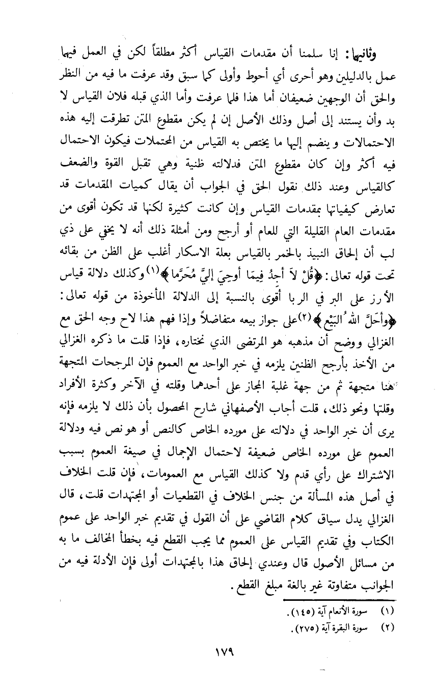 وثانيهما: إنا سلمنا ان مقدمات القياس اكثر مطلقا لكن في العمل فيهما عمل بالدليلين وهو أحرى أي أحوط وأولى كما سبق وقد عرفت ما فيه من النظر والحق ان الوجهين ضعيفان أما هذا فلما عرفت واما الذي قبله فلأن القياس لا بد وأن يستند إلى أصل وذلك الأصل ان لم يكن مقطوع المتن تطرقت إليه هذه الإحتمالات وينضم إليها ما يختص به القياس من المحتملات فيكون الاحتمال فيه اكثر وان كان مقطوع المتن فدلالته ظنية وهي تقبل القوة والضعف كالقياس وعند ذلك نقول الحق في الجواب ان يقال كميات المقدمات قد تعارض كيفياتها بمقدمات القياس وإن كانت كثيرة لكنها قد تكون أقوى من مقدمات العام القليلة التي للعام او أرجح ومن أمثلة ذلك أنه لا يخفى على ذي لب أن إلحاق النبيذ بالخمر بالقياس بعلة الإسكار اغلب على الظن من بقائه تحت قوله تعالى: {قُلْ لا أَجِدُ فِي مَا أُوحِيَ إِلَيَّ مُحَرَّماً} ١ وكذلك دلالة قياس الأرز على البر في الربا أقوى بالنسبة الى الدلالة المأخوذة من قوله تعالى: {وَأَحَلَّ اللَّهُ الْبَيْعَ} ٢ على جواز بيعه متفاضلا وإذا فهم هذا لاح وجه الحق مع الغزالي ووضح ان مذهبه هو المرتضى الذي نختاره فإذا قلت ما ذكره الغزالي من الأخذ بأرجح الظنين يلزمه في خبر الواحد مع العموم فإن المرجحات المتجهة هنا متجهة ثم من جهة غلبة المجاز على أحدهما وقلته في الآخر وكثرة الأفراد وقلتها ونحو ذلك قلت أجاب الأصفهاني شارح المحصول بأن ذلك لا يلزمه فإنه يرى ان خبر الواحد في دلالته على مورده الخاص كالنص او هو نص فيه ودلالة العموم على مورده الخاص ضعيفة لاحتمال الإجمال في صيغة العموم بسبب الاشتراك على رأي قدم ولا كذلك القياس مع العمومات فإن قلت الخلاف في اصل هذه المسألة من جنس الخلاف في القطعيات او المجتهدات قلت قال الغزالي يدل سياق كلام القاضي على ان القول في تقديم خبر الواحد على عموم الكتاب وفي تقديم القياس على العموم مما يجب القطع فيه بخطأ المخالف ما به من مسائل الأصول قال وعندي إلحاق هذا بالمجتهدات أولى فإن الأدلة فيه من الجوانب متفاوتة غير بالغة مبلغ القطع.