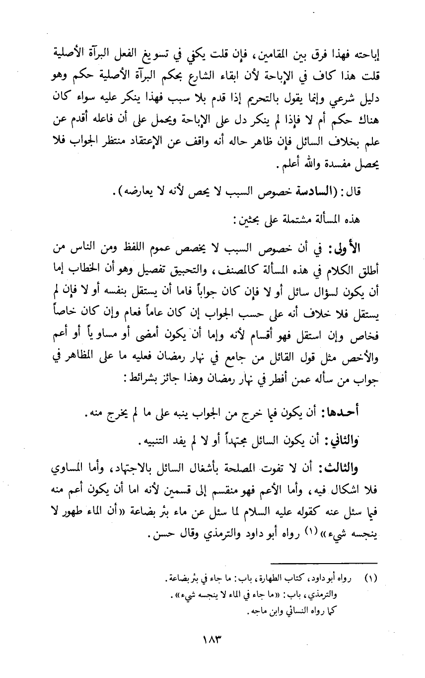 والثالث: ان لا تفوت المصلحة بأشغال السائل بالاجتهاد وأما المساوي فلا إشكال فيه وأما الأعم فهو منقسم إلى قسمين لأنه إما ان يكون اعم منه فيما سئل عنه كقوله عليه السلام: لما سئل عن ماء بئر بضاعة: "أن الماء طهور لا ينجسه شيء" ١ رواه أبو داود والترمذي وقال حسن.