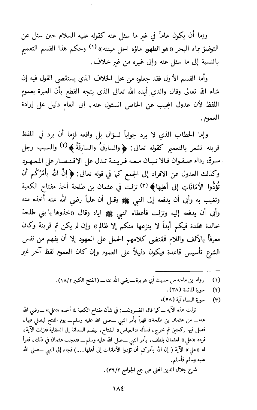 وإما الخطاب الذي لا يرد جوابا لسؤال بل واقعة فإما ان يرد في اللفظ قرينه تشعر بالتعميم كقوله تعالى: {وَالسَّارِقُ وَالسَّارِقَةُ} ٢ والسبب رجل سرق رداء صفوان فالإتيان معه قرينة تدل على الاقتصار على المعهود وكذلك العدول عن الإفراد الى الجمع كما في قوله تعالى: {إِنَّ اللَّهَ يَأْمُرُكُمْ أَنْ تُؤَدُّوا الْأَمَانَاتِ إِلَى أَهْلِهَا} ٣ نزلت في عثمان بن طلحة اخذ مفتاح الكعبة وتغيب به وأبى ان يدفعه إلى النبي صلى الله عليه وسلم وقيل ان عليا رضي الله عنه أخذه منه وأبى ان يدفعه إليه ونزلت فأعطاه النبي صلى الله عليه وسلم اياه وقال "خذوها يا بني طلحة خالده مخلدة فيكم أبدا لا ينزعها منكم إلا ظالم" وإن لم يكن ثم قرينة وكان معرفا بالألف واللام فمقتضى كلامهم الحمل على المعهود إلا ان يفهم من نفس الشرع تأسيس قاعدة فيكون دليلا على العموم وإن كان العموم لفظ آخر غير