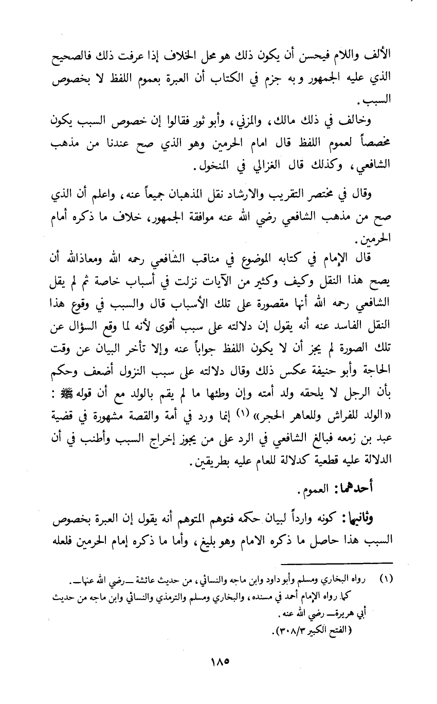وثانيهما: كونه واردا لبيان حكمه فتوهم المتوهم انه يقول ان العبرة بخصوص السبب هذا حاصل ما ذكره الإمام وهو بليغ واما ما ذكره إمام الحرمين فلعله