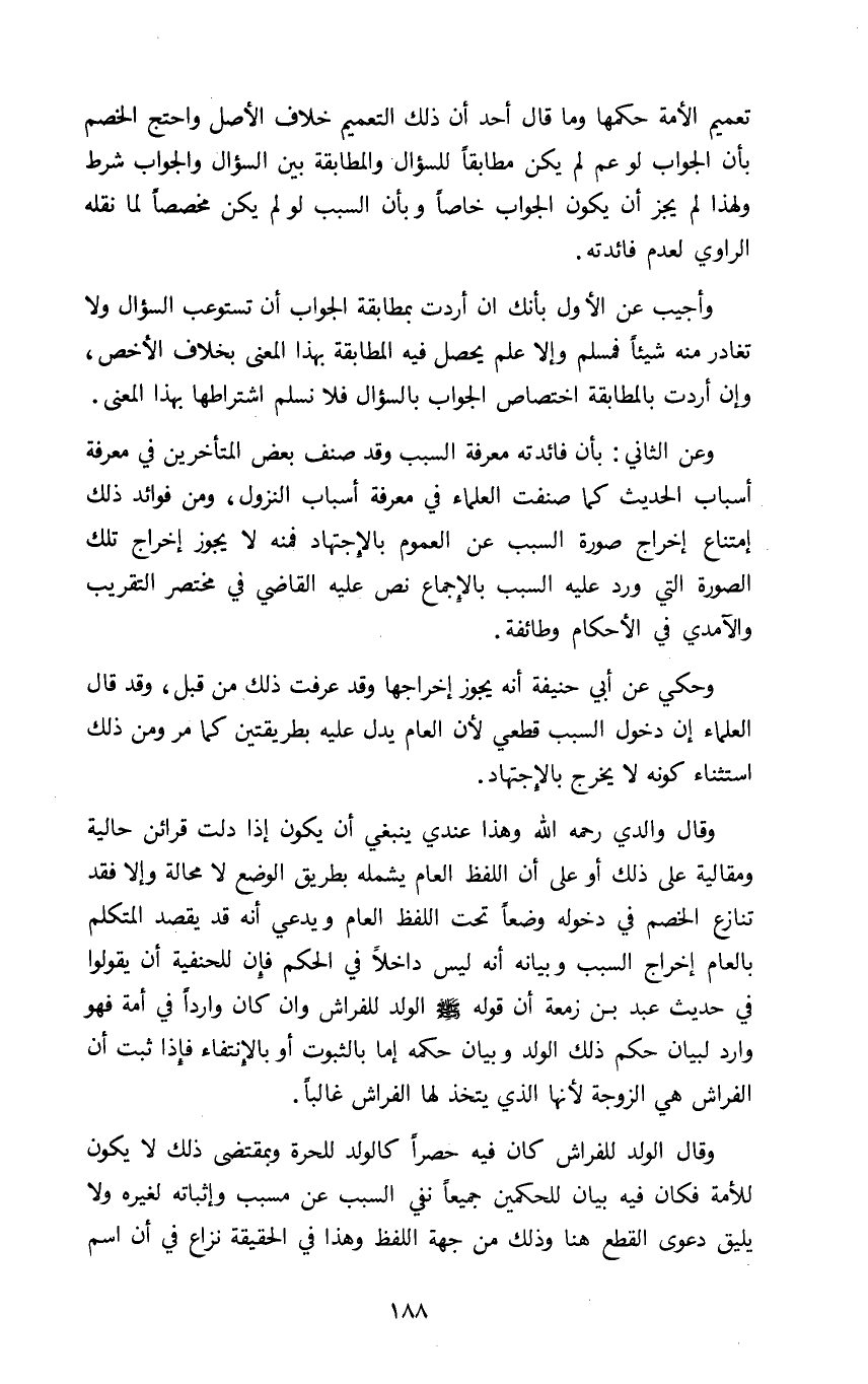تعميم الأمة حكمها وما قال أحد ان ذلك التعميم خلاف الأصل واحتج الخصم بأن الجواب لو عم لم يكن مطابقا للسؤال والمطابقة بين السؤال والجواب شرط ولهذا لم يجز ان يكون الجواب خاصا وبأن السبب لو لم يكن مخصصا لما نقله الراوي لعدم فائدته.