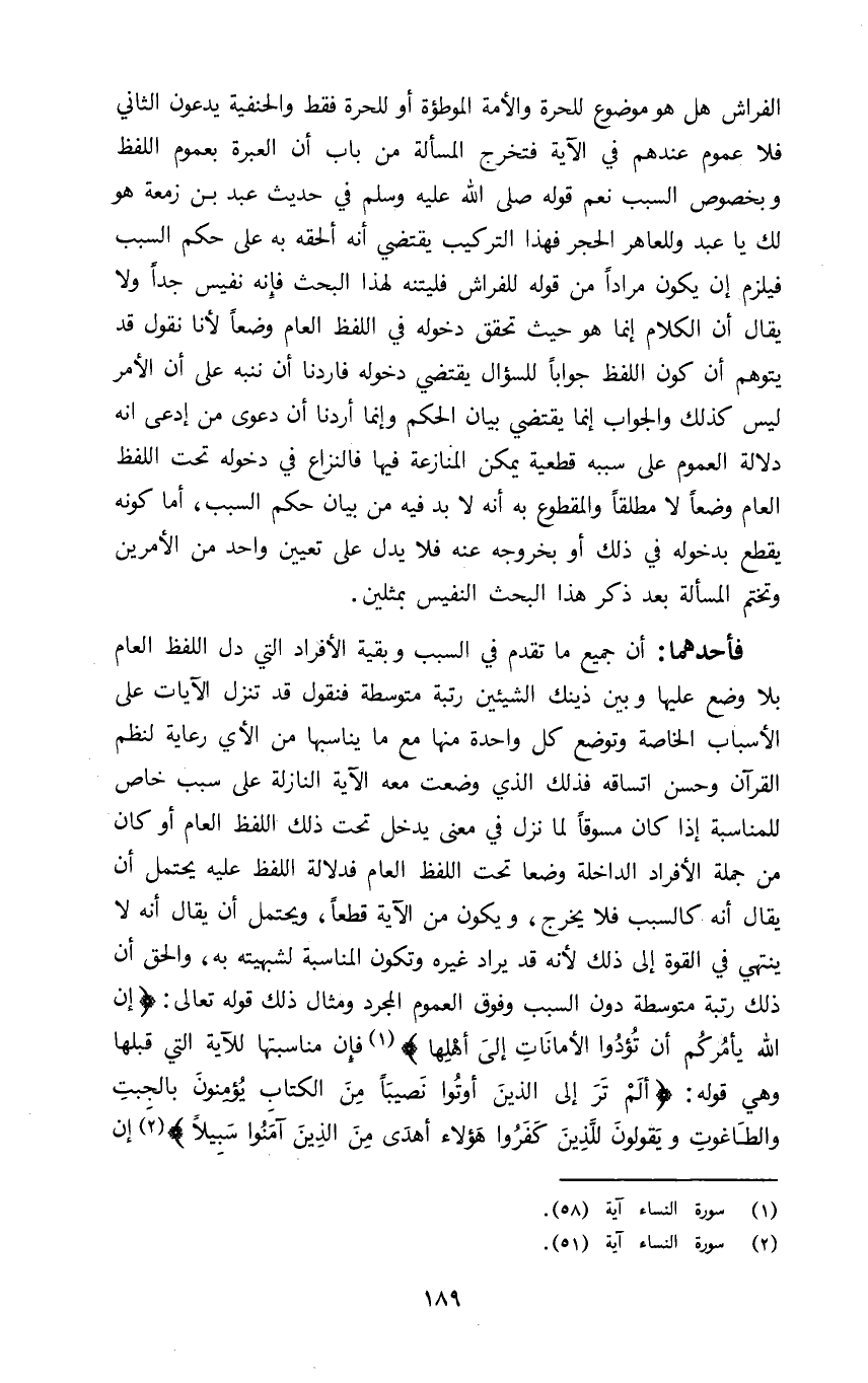 فأحدهما: أن جميع ما تقدم في السبب وبقية الأفراد التي دل اللفظ العام بلا وضع عليها وبين ذينك الشيئين رتبة متوسطة فنقول قد تنزل الآيات على الأسباب الخاصة وتوضع كل واحدة منها مع ما يناسبها من الأي رعاية لنظم القرآن وحسن اتساقه فلذلك الذي وضعت معه الآية النازلة على سبب خاص للمناسبة إذا كان مسوقا لما نزل في معنى يدخل تحت ذلك اللفظ العام او كان من جملة الأفراد الداخلة وضعا تحت اللفظ العام فدلالة اللفظ عليه يحتمل ان يقال انه كالسبب فلا يخرج ويكون من الآية قطعا ويحتمل ان يقال انه لا ينتهي في القوة الى ذلك لأنه قد يراد غيره وتكون المناسبة لشبهيته به والحق ان ذلك رتبة متوسطة دون السبب وفوق العموم المجرد ومثال ذلك قوله تعالى: {إِنَّ اللَّهَ يَأْمُرُكُمْ أَنْ تُؤَدُّوا الْأَمَانَاتِ إِلَى أَهْلِهَا} ١ فإن مناسبتها للآية التي قبلها وهي قوله: {أَلَمْ تَرَ إِلَى الَّذِينَ أُوتُوا نَصِيباً مِنَ الْكِتَابِ يُؤْمِنُونَ بِالْجِبْتِ وَالطَّاغُوتِ وَيَقُولُونَ لِلَّذِينَ كَفَرُوا هَؤُلاءِ أَهْدَى مِنَ الَّذِينَ آمَنُوا سَبِيلاً} ٢ إن
