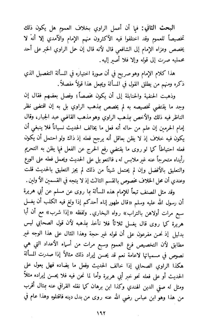 البحث الثاني: فيما أن أعمل الراوي بخلاف العموم هل يكون ذلك تخصيصا للعموم وقد اختلفوا فيه الاكثرون منهم الإمام والآمدي الا انه لا يخصص وعزاه الإمام الى الشافعي قال لأنه قال ان حمل الراوي الخبر على أحد محمليه صرت إلى قوله وإلا فلا أصير إليه.