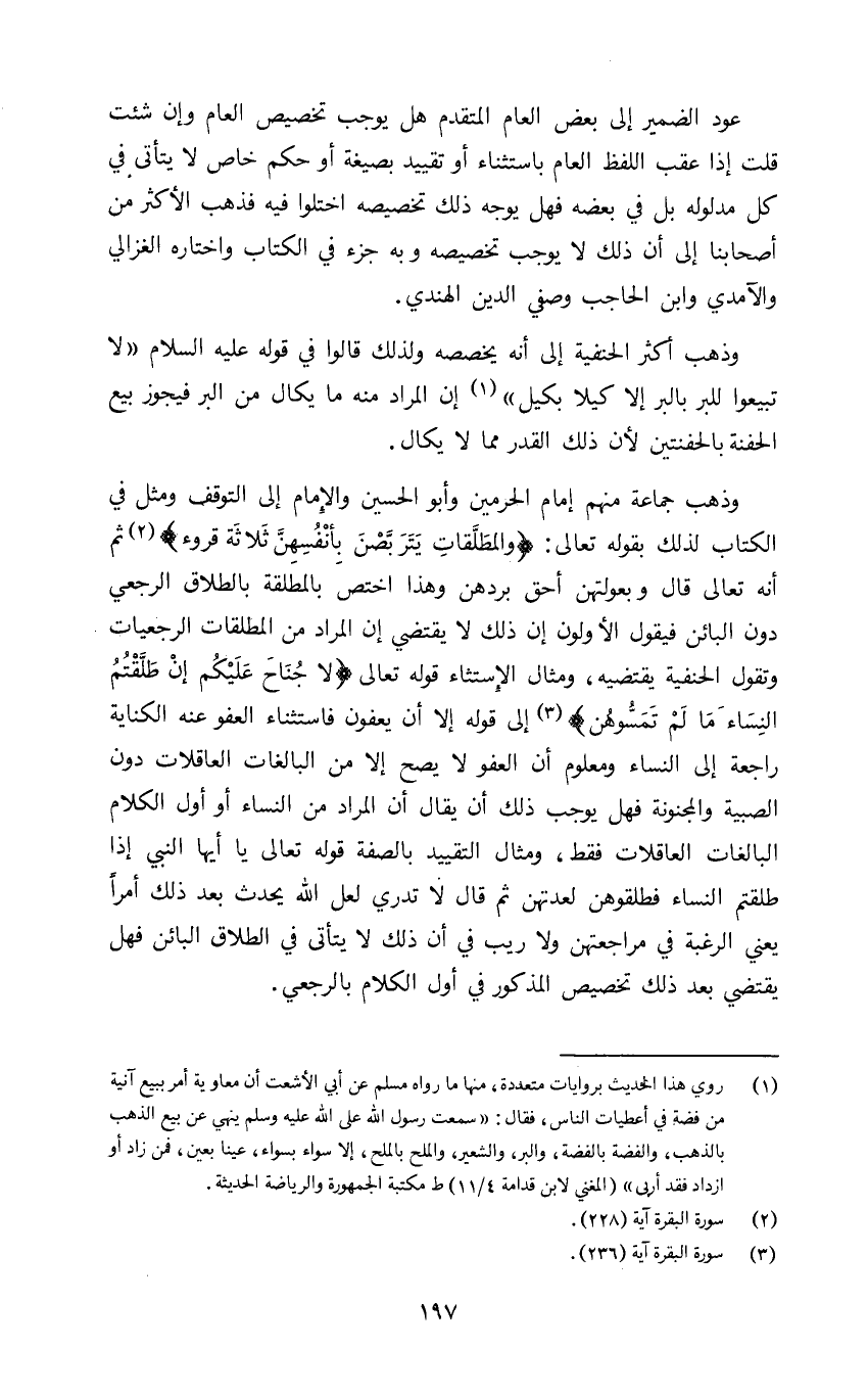 وذهب جماعة منهم إمام الحرمين وأبو الحسين والإمام إلى التوقف ومثل في الكتاب لذلك بقوله تعالى: {وَالْمُطَلَّقَاتُ يَتَرَبَّصْنَ بِأَنْفُسِهِنَّ ثَلاثَةَ قُرُوءٍ} ٢ ثم أنه تعالى قال: {وَبُعُولَتُهُنَّ أَحَقُّ بِرَدِّهِنَّ} وهذا اختص بالمطلقة بالطلاق الرجعي دون البائن فيقول الأولون ان ذلك لا يقتضي إن المراد من المطلقات الرجعيات وتقول الحنفية يقتضيه ومثال الإستثناء قوله تعالى: {لَاجُنَاحَ عَلَيْكُمْ إِنْ طَلَّقْتُمُ النِّسَاءَ مَا لَمْ تَمَسُّوهُنَّ} ٣ الى قوله: {إِلَّا أَنْ يَعْفُونَ} فإستثناء العفو عنه الكناية راجعة الى النساء ومعلوم أن العفو لا يصح الا من البالغات العاقلات دون الصبية والمجنونة فهل يوجب ذلك ان يقال ان المراد من النساء أو أول الكلام البالغات العاقلات فقط ومثال التقييد بالصفة قوله تعالى: {يَا أَيُّهَا النَّبِيُّ إِذَا طَلَّقْتُمُ النِّسَاءَ فَطَلِّقُوهُنَّ لِعِدَّتِهِنَّ} ثم قال: {لا تَدْرِي لَعَلَّ اللَّهَ يُحْدِثُ بَعْدَ ذَلِكَ أَمْراً} يعنى الرغبة في مراجعتهن ولا ريب في ان ذلك لا يتأتى في الطلاق البائن فهل يقتضي بعد ذلك تخصيص المذكور في أول الكلام بالرجعي.