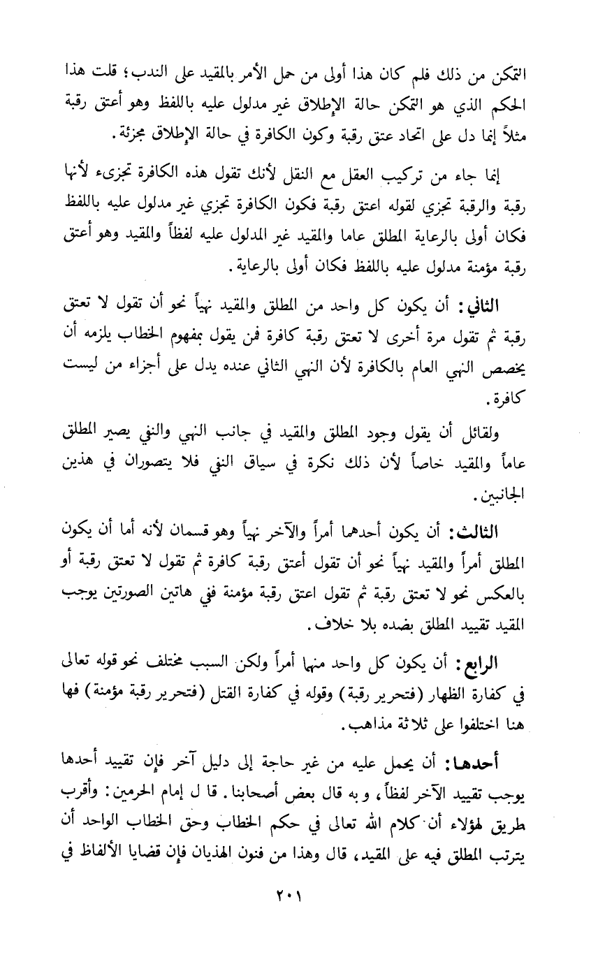 الرابع: ان يكون كل واحد منهما أمرا ولكن السبب مختلف نحو قوله تعالى في كفارة الظهار: {فَتَحْرِيرُ رَقَبَةٍ} وقوله في كفارة القتل: {فَتَحْرِيرُ رَقَبَةٍ مُؤْمِنَةٍ} فها هنا اختلفوا على ثلاثة مذاهب.