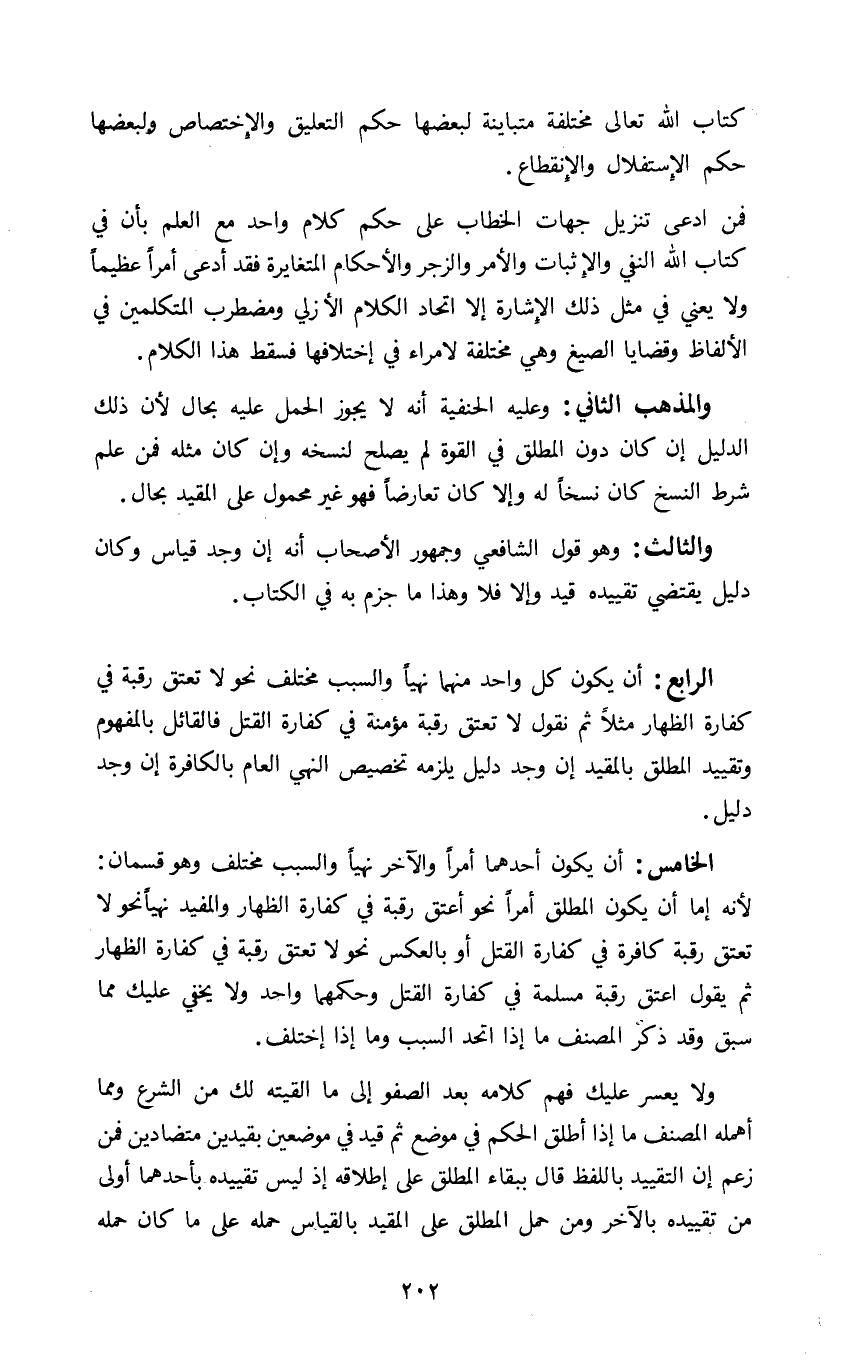 الرابع: ان يكون كل واحد منهما نهيا والسبب مختلف نحو لا تعتق رقبة في كفارة الظهار مثلا ثم نقول لا تعتق رقبة مؤمنة في كفارة القتل فالقائل بالمفهوم وتقييد المطلق بالمقيد ان وجد دليل تخصيص النهي العام بالكافرة ان وجد دليل.