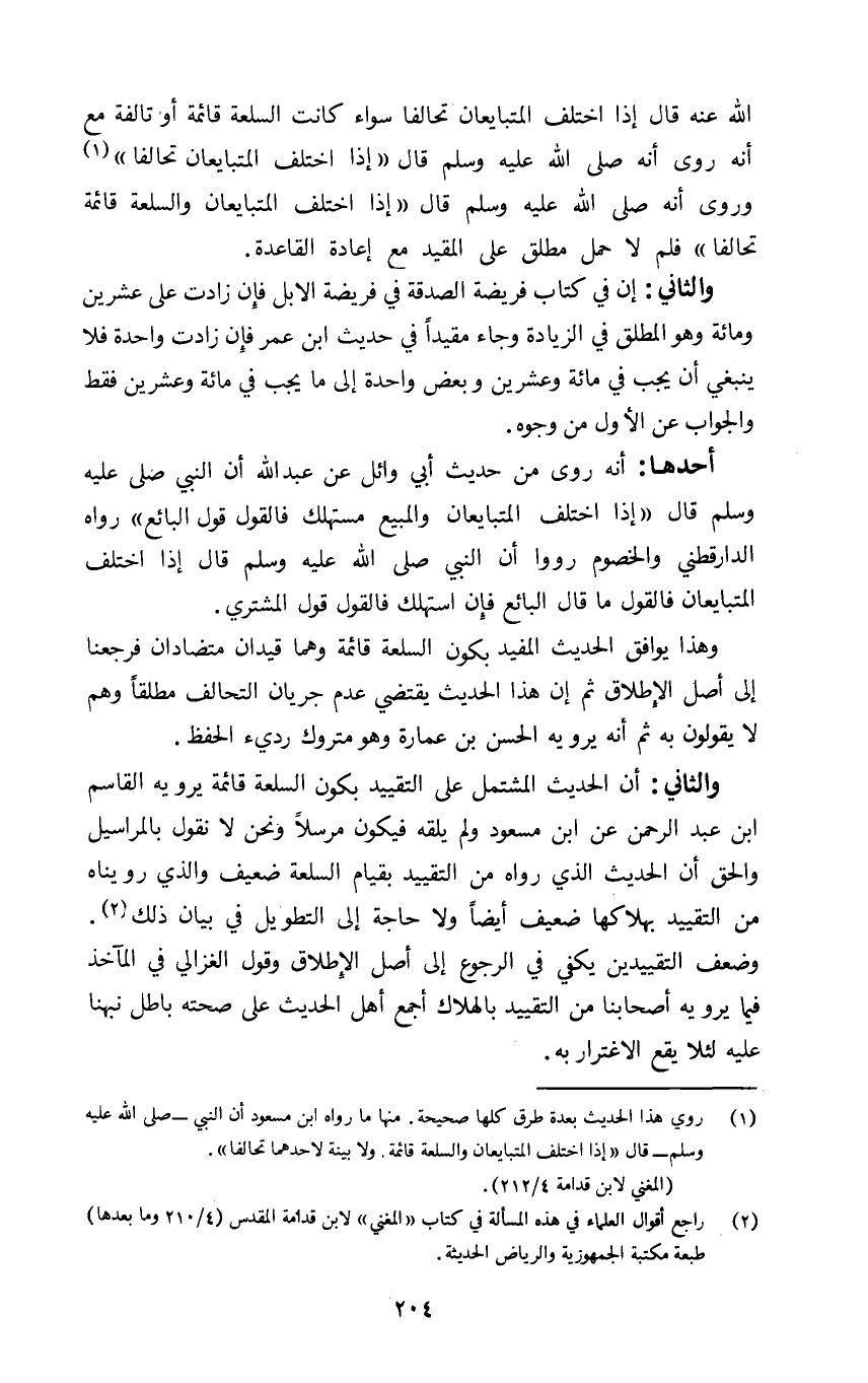 والثاني: أن الحديث المشتمل على التقييد بكون السلعة قائمة يرويه القاسم ابن عبد الرحمن عن ابن مسعود ولم يلقه فيكون مرسلا ونحن لا نقول بالمراسيل والحق ان الحديث الذي رواه من التقييد بقيام السلعة ضعيف والذي رويناه من التقييد بهلاكها ضعيف ايضا ولا حاجة الى التطويل في بيان ذلك٢.