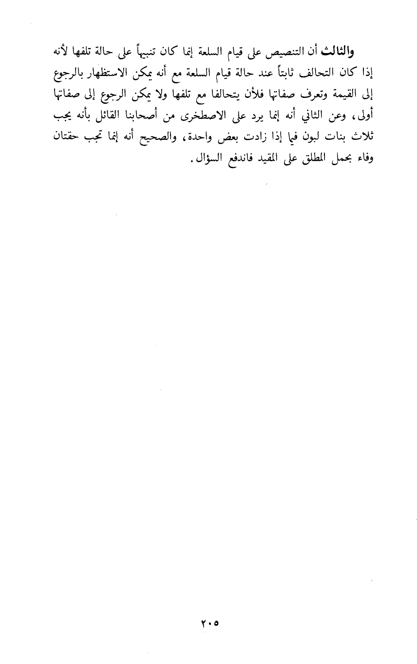 والثالث أن التنصيص على قيام السلعة إنما كان تنبيها على حالة تلفها لأنه إذا كان التحالف ثابتا عند حالة قيام السلعة مع انه يمكن الاستظهار بالرجوع الى القيمة وتعرف صفاتها فلأن يتحالفا مع تلفها ولا يمكن الرجوع الى صفاتها أولى وعن الثاني انه إنما يرد على الاصطخري من أصحابنا القائل بأنه يجب ثلاث بنات لبون فيما إذا زادت بعض واحدة والصحيح انه إنما تجب حقتان وفاء بحمل المطلق على المقيد فاندفع السؤال.