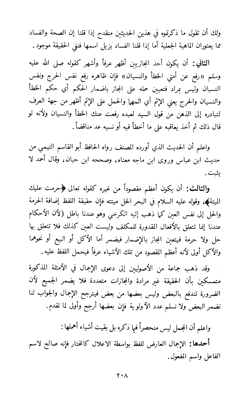 الثاني: ان يكون أحد المجازيين أظهر عرفا أشهر كقوله صلى الله عليه وسلم: "رفع عن امتي الخطأ والنسيان" فإن ظاهره رفع نفس الحرج ونفس النسيان وليس بمراد فتعيين حمله على المجاز بإضمار الحكم أي حكم الخطأ والنسيان والحرج يعني الإثم أي اثمهما والحمل على الإثم اظهر من جهة العرف لتبادره الى الذهن من قول السيد لعبده رفعت عنك الخطأ والنسيان ولأنه لو قال ذلك ثم اخذ يعاقبه على ما اخطأ فيه أو نسيه عد مناقضا.