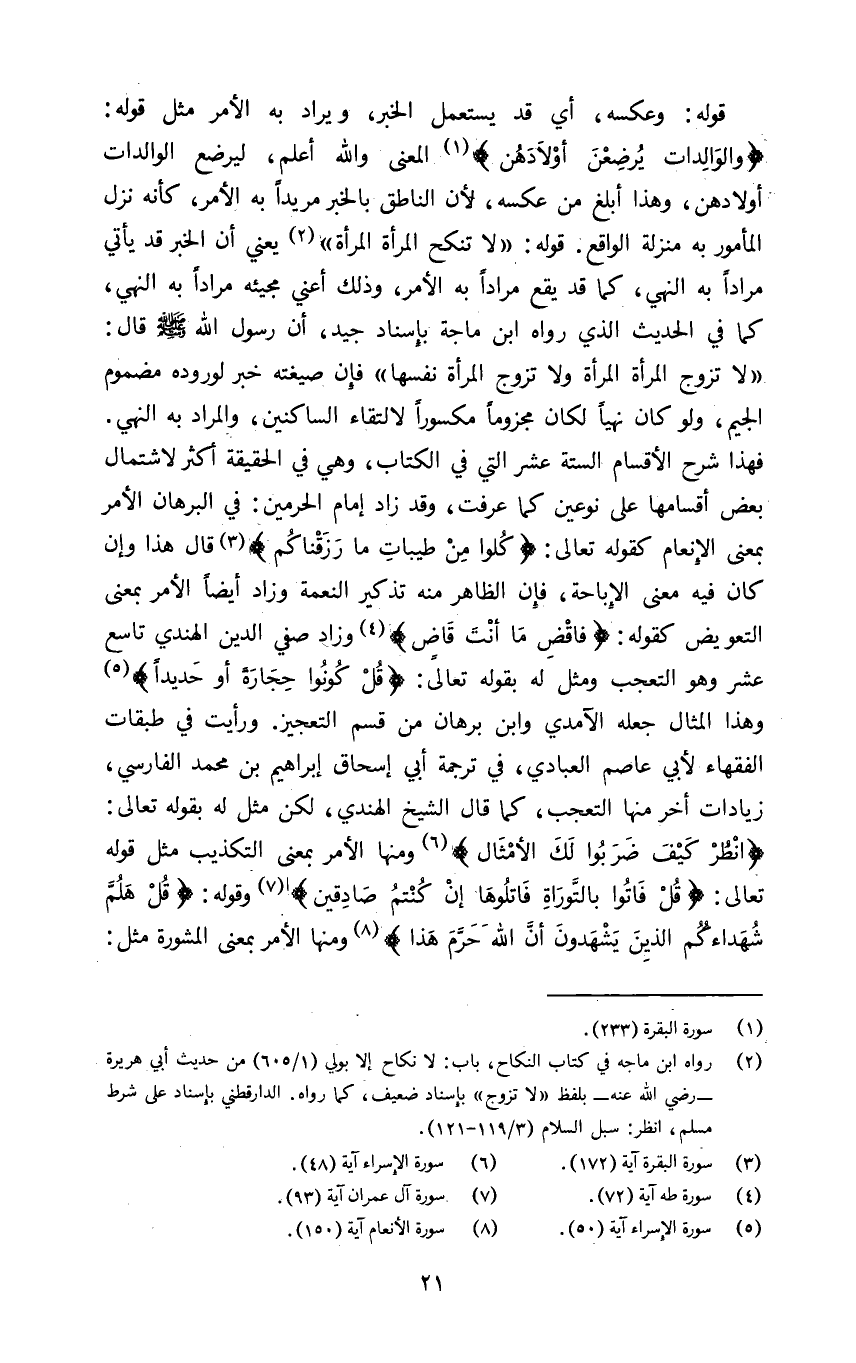 "لا تزوج المرأة المرأة ولا تزوج المرأة نفسها" فإن صيغته خبر لوروده مضموم الجيم ولو كان نهيا لكان مجزوما مكسورا لالتقاء الساكنين والمراد به النهي فهذا شرح الأقسام الستة عشر التي في الكتاب وهي في الحقيقة أكثر لاشتمال بعض أقسامها على نوعين كما عرفت وقد زاد إمام الحرمين في البرهان الأمر بمعنى الإنعام كقوله تعالى: {كُلُوا مِنْ طَيِّبَاتِ مَا رَزَقْنَاكُمْ} ٣ قال هذا وإن كان فيه معنى الإباحة فان الظاهر منه تذكير النعمة وزاد أيضا الأمر بمعنى التعويض كقوله: {فَاقْضِ مَا أَنْتَ قَاضٍ} ٤ وزاد صفي الدين الهندي تاسع عشر وهو التعجب ومثل له بقوله تعالى: {قُلْ كُونُوا حِجَارَةً أَوْ حَدِيداً} ٥ وهذا المثال جعله الآمدي وابن برهان من قسم التعجيز ورأيت في طبقات الفقهاء لأبى عاصم العبادي في ترجمة أبى إسحاق إبراهيم بن محمد الفارسي زيادات أخر منها التعجب كما قال الشيخ الهندي لكن مثل له بقوله تعالى: {انْظُرْ كَيْفَ ضَرَبُوا لَكَ الْأَمْثَالَ} ٦ ومنها الأمر بمعنى التكذيب مثل قوله تعالى: {قُلْ فَأْتُوا بِالتَّوْرَاةِ فَاتْلُوهَا إِنْ كُنْتُمْ صَادِقِينَ} ٧ وقوله: {قُلْ هَلُمَّ شُهَدَاءَكُمُ الَّذِينَ يَشْهَدُونَ أَنَّ اللَّهَ حَرَّمَ هَذَا} ٨ ومنها الأمر بمعنى المشورة مثل: