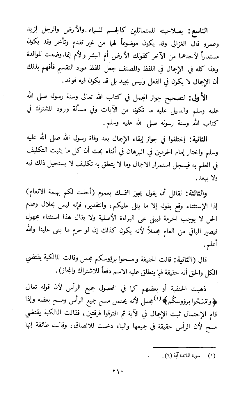 قال الثانية: قالت الحنفية وامسحوا برؤوسكم مجمل وقالت المالكية يقتضي الكل والحق انه حقيقة فيما ينطلق عليه الاسم دفعا للاشتراك والمجاز.