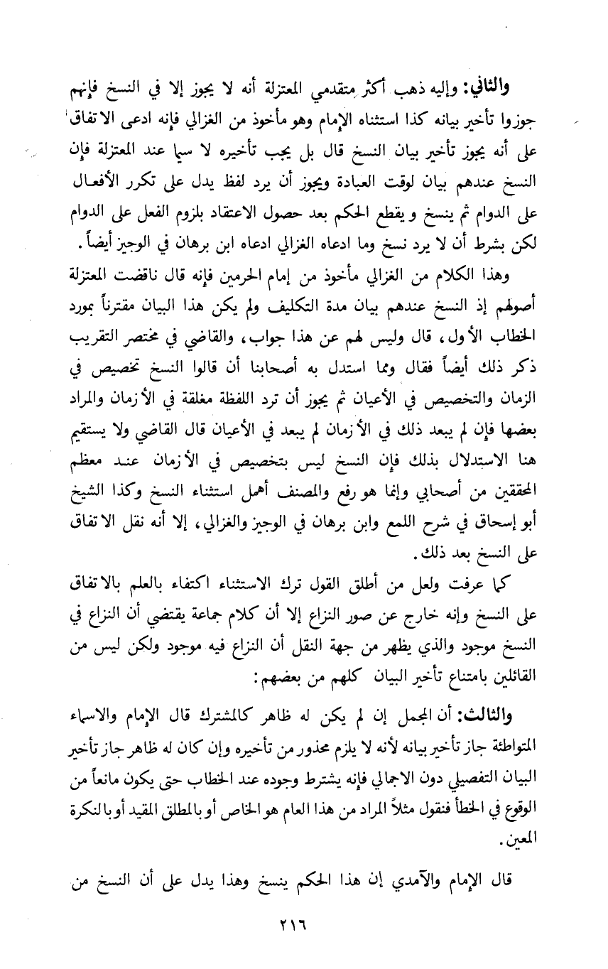 والثاني: وإليه ذهب اكثر متقدمي المعتزلة انه لا يجوز الا في النسخ فإنهم جوزوا تأخير بيانه كذا استثناه الإمام وهو مأخوذ من الغزالي فإنه ادعى الاتفاق على انه يجوز تأخير بيان النسخ قال بل يجب تأخيره لا سيما عند المعتزلة فإن النسخ عندهم بيان لوقت العبادة ويجوز ان يرد لفظ يدل على تكرر الأفعال على الدوام ثم ينسخ ويقطع الحكم بعد حصول الاعتقاد بلزوم الفعل على الدوام لكن بشرط ان لا يرد نسخ وما ادعاه الغزالي ادعاه ابن برهان في الوجيز أيضا.